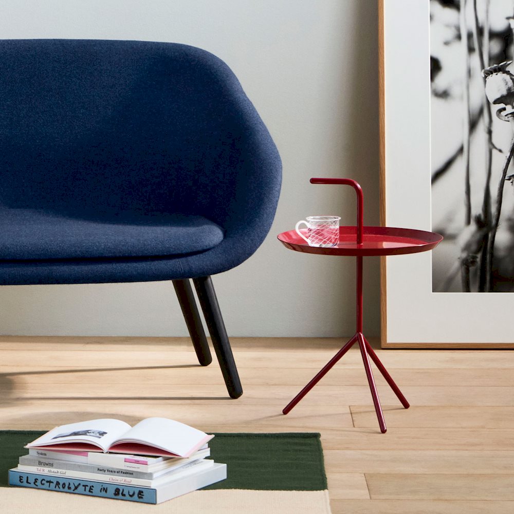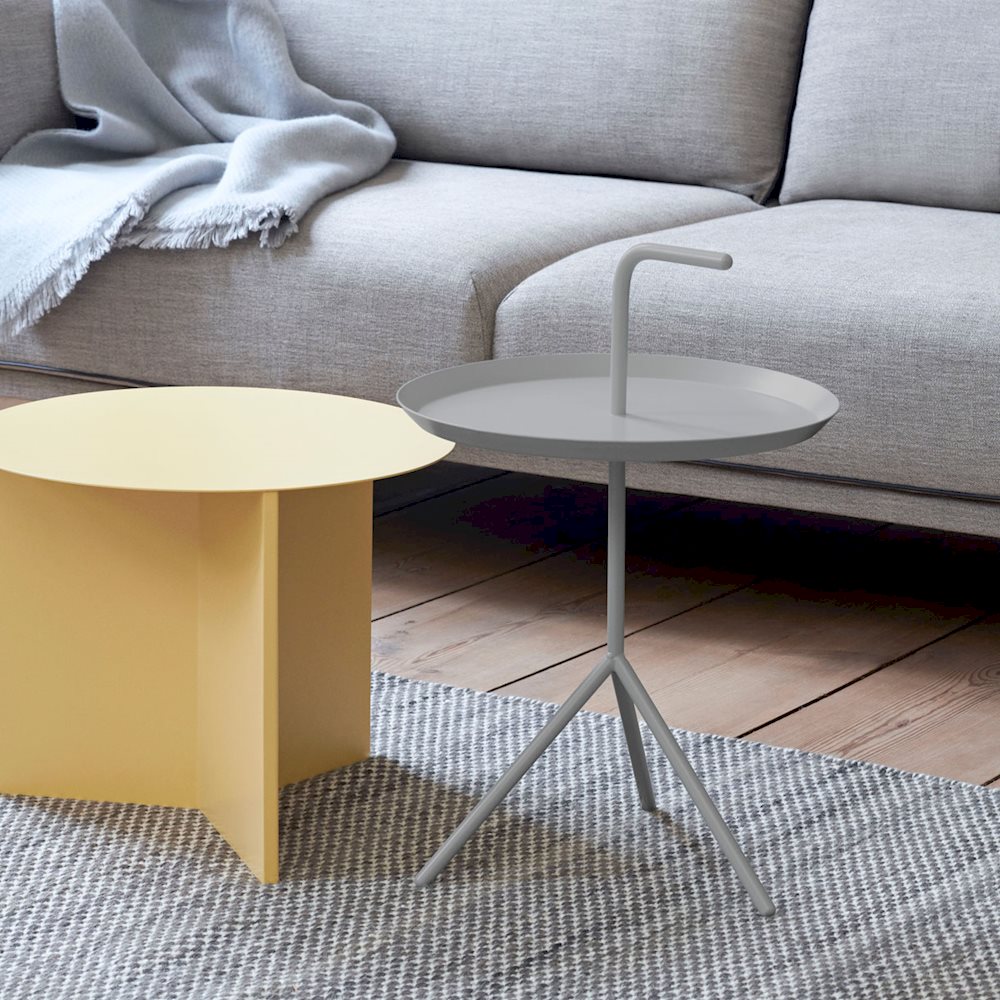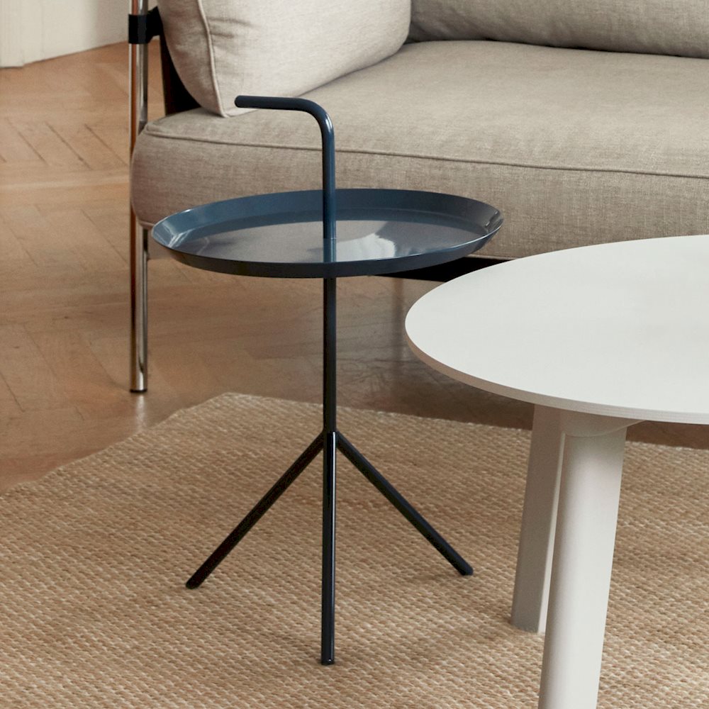 Thomas Bentzens bærbare sidebord er treffende kalt ‘Don’t Leave Me’. Forkortet til DLM, og har et praktisk håndtak som gjør det mulig å bære metallbordet fra rom til rom. Selv om det har en lett og bærbar struktur, gir de tre skrå beina stor stabilitet. DLM og DLM XL, som er tilgjengelige i to størrelser, gir funksjonelle alternativer til tradisjonelle salongbord. Passer for innvendig bruk i de fleste hjemme- eller kontormiljøer.