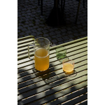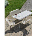 Bordet er laget i slitesterkt, pulverlakkert eller galvanisert stål som tåler vær og vind året rundt. Den lamellerte bordplaten gir et lett og luftig uttrykk, samtidig som regnvann enkelt renner av. Bordet har plass til opptil seks personer, og passer perfekt på terrassen, i hagen, på hytta eller i uteserveringer