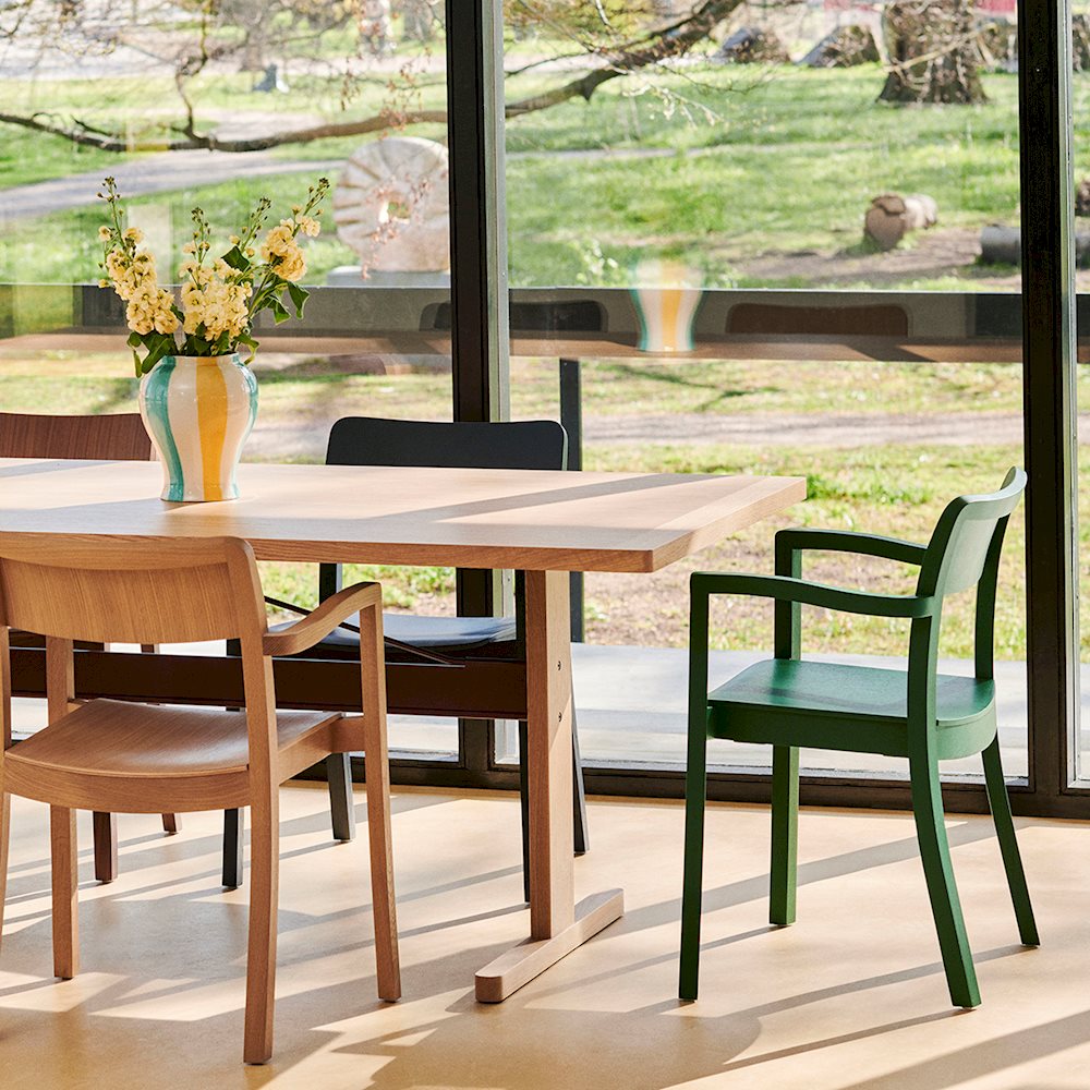 DAW-utgaven m/armlene har spisebordhøyde og tre-understell i Lønn og sorte stål-detaljer. Stolskallet fåes i en rekke delikate farger.