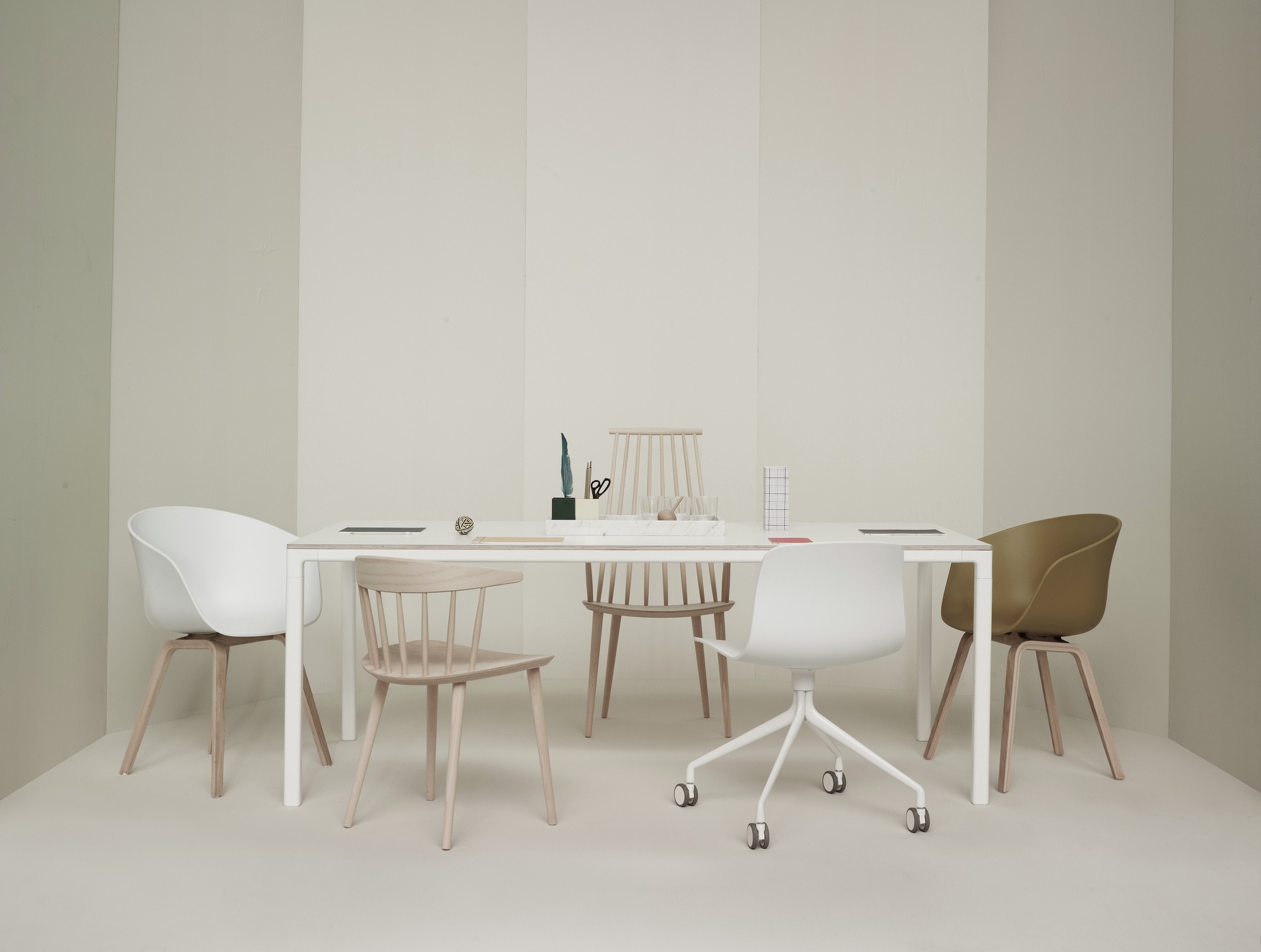 DAW-utgaven m/armlene har spisebordhøyde og tre-understell i Lønn og sorte stål-detaljer. Stolskallet fåes i en rekke delikate farger.