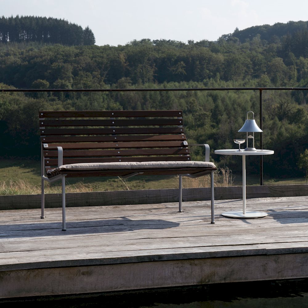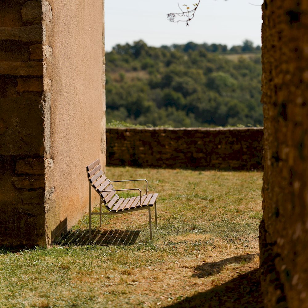 Designet for HAY av Erwan Bouroullec, er Traverse Lounge Bench en del av en utemøbelkolleksjon designet for naturlig å blande seg inn uansett hvor den er plassert. Benken består av en presstøpt aluminiumsramme med lamellsete i varmebehandlet ask, og kombinerer en robust konstruksjon med et innbydende uttrykk som naturlig patinerer for å gjøre den vakrere over tid. Med sin velbalanserte estetikk og ergonomiske design, kan Traverse Lounge Bench brukes sammen med andre Traverse-møbler for å slappe av og sosialisere i et bredt spekter av private og offentlige rom. Tilgjengelig med eller uten armlener.