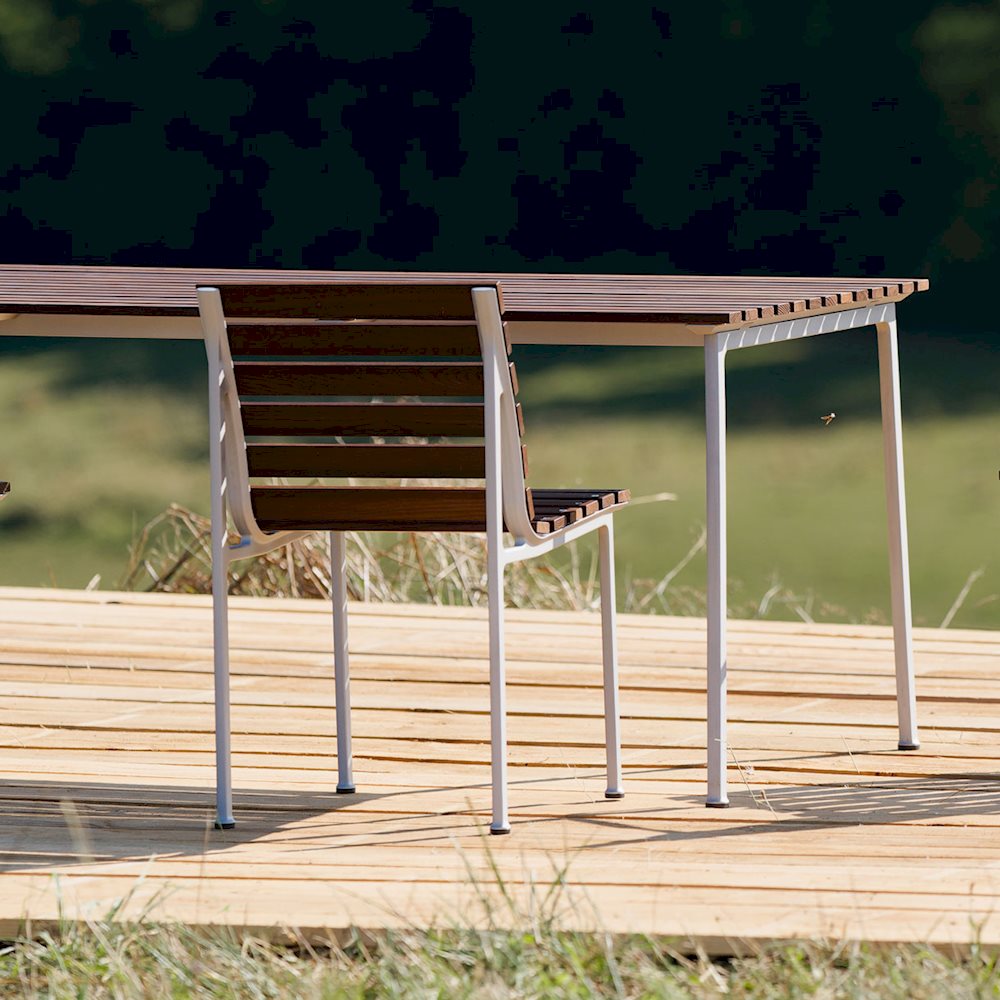 Designet for HAY av Erwan Bouroullec, er Traverse-stolen og lenestolen en del av en utemøbelkolleksjon designet for naturlig å blande seg inn uansett hvor den er plassert. Stolene består av en aluminiumsramme med lamellsete i varmebehandlet ask, og kombinerer en robust konstruksjon med et innbydende uttrykk som naturlig patinerer for å gjøre dem vakrere over tid. Med sin velbalanserte estetikk og ergonomiske design, kan Traverse Chair og Lenestol brukes sammen med Traverse Tables for å skape spisestue og sosiale oppsett i et bredt spekter av private og offentlige rom.