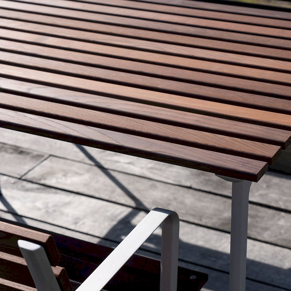 Designet for HAY av Erwan Bouroullec, er Traverse Table en del av en utemøbelkolleksjon designet for naturlig å blande seg inn uansett hvor den er plassert. Bordet består av en presstøpt aluminiumsramme med spalteplate i varmebehandlet ask, og kombinerer en robust konstruksjon med et innbydende uttrykk som naturlig patinerer for å gjøre det vakrere over tid. Med sin velbalanserte estetikk og ulike størrelsesalternativer, kan Traverse-bordet brukes med andre Traverse-møbler for å spise og sosialisere i et bredt spekter av private og offentlige rom.