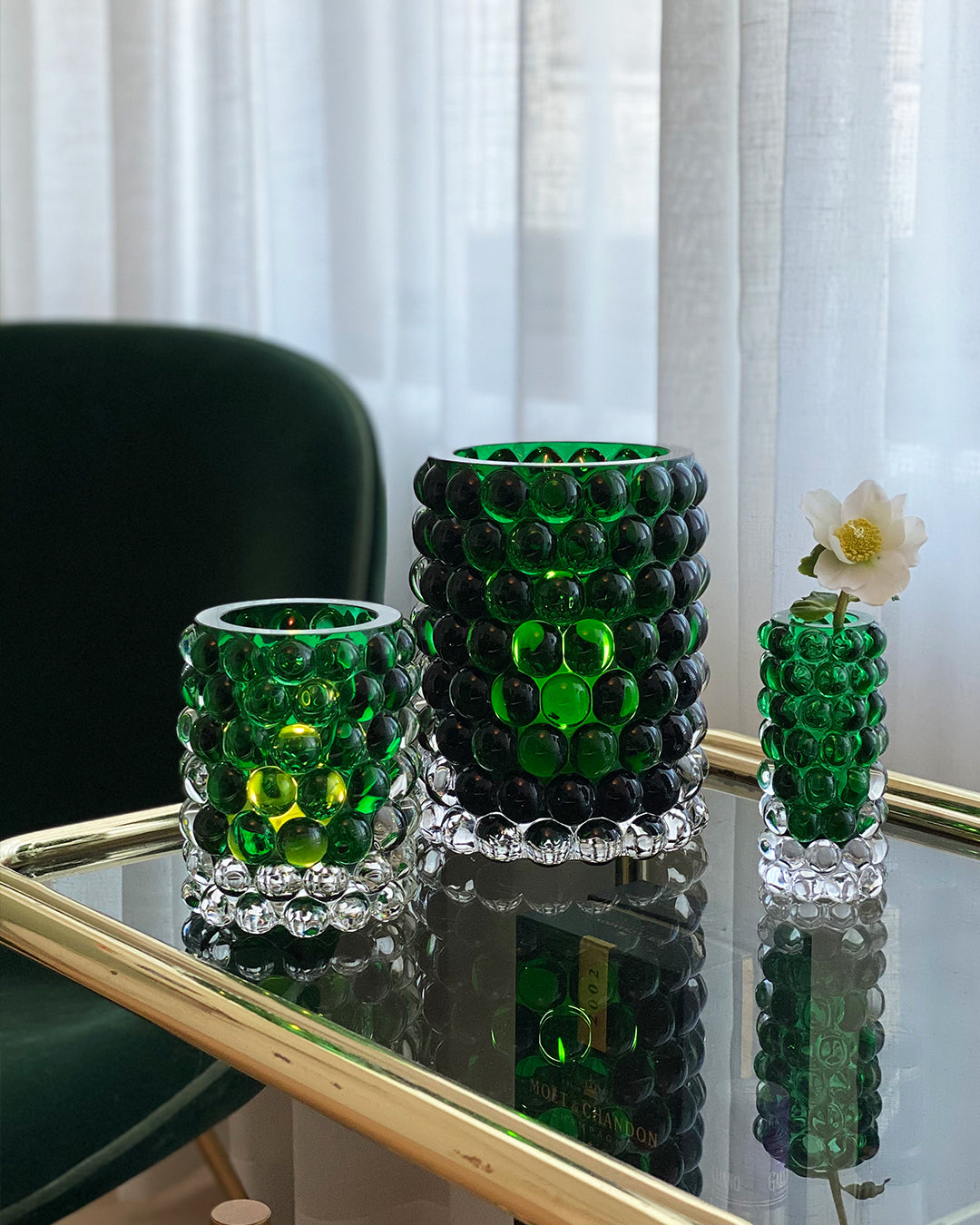 Hurricane Boule er vår mest populære lanterne. Håndblåst på landsbygda i Böhmen, hvor verdens beste glassblåsere finnes. Boblene, laget i en støpejernsform, gir Boule sitt unike optiske mønster og en luksuriøst tung følelse. Det er utrolig vakkert å blande med de metalliske Classic-lyktene.