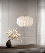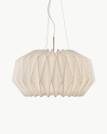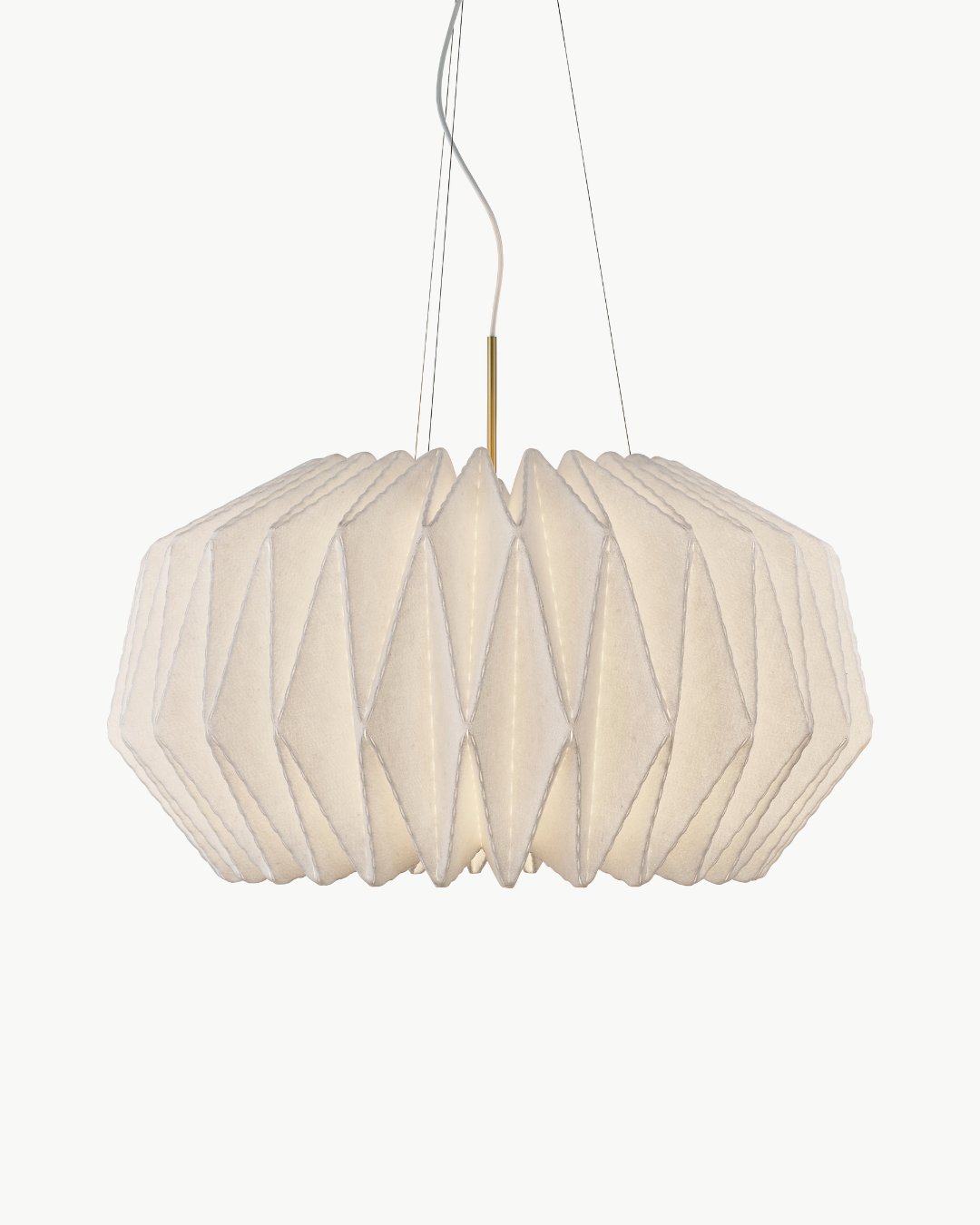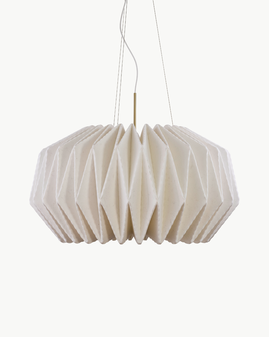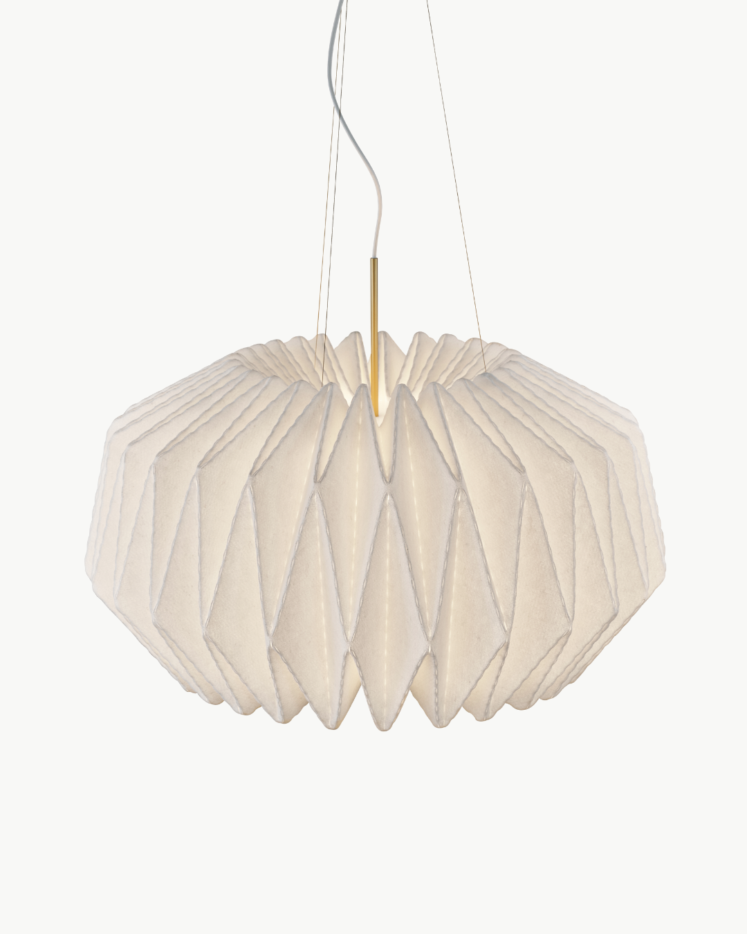 Softly Pleated I XL er den største modellen i serien, med en diameter på 94 cm og høyde på 54 cm. Den håndplisserte filten gir lampen et mykt og organisk uttrykk, samtidig som de presise foldene sørger for klart nedadgående lys kombinert med en varm, stemningsfull glød.