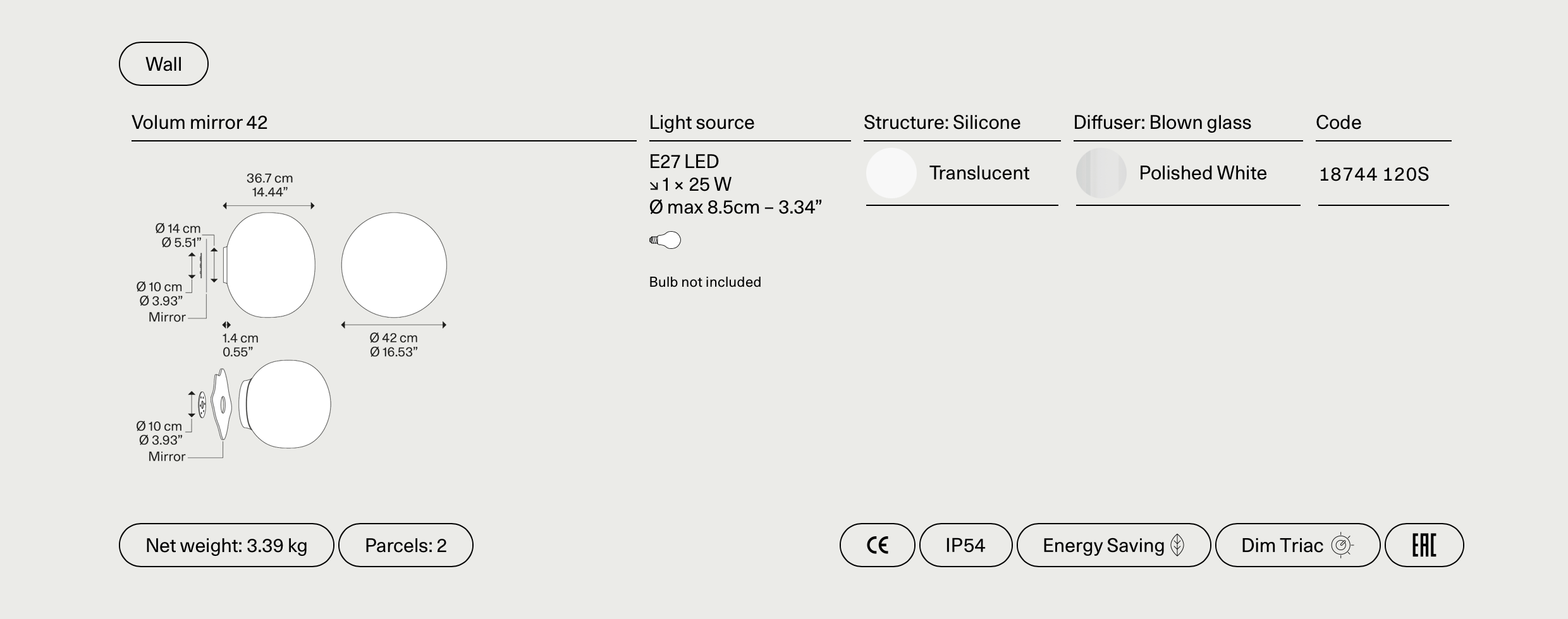 I bordversjonen har Volum en dimmer som lar brukerne justere lysintensiteten og lage variable effekter etter behov. De nye tak- og veggmonterte versjonene har en IP 54-klassifisering, som sikrer beskyttelse mot eksterne midler som støv eller vannsprut og gjør at Volum kan brukes i fuktige miljøer som bad eller spa. Det er også mulighet for å feste en flens på baksiden av sokkelen for å feste lampen på speilflater og lage skreddersydde belysningsarrangementer.
