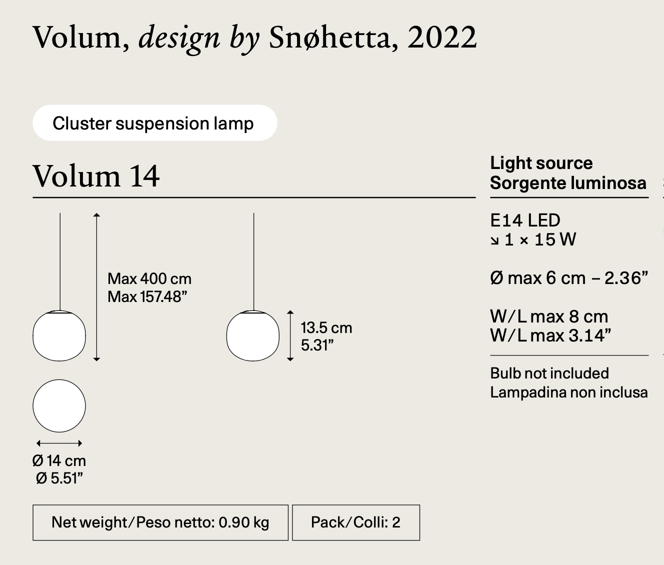 Volum er en eksklusiv serie med glasslamper som er poetisk enkle, men komplekse i teknisk utførelse. De fire blåste glasskulene med blank hvit finish kommer i forskjellige størrelser som måler 14, 22, 29 og 42 cm i diameter. Takket være deres iboende distinkte former, utfyller de hverandre intuitivt for å danne unike komposisjoner.