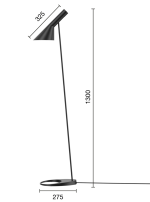 Designet av Arne Jacobsen i 1957 for SAS Royal Hotel i København, er AJ Gulvlampe en ikonisk del av hans berømte AJ-serie. Lampen gir et behagelig, nedadrettet lys gjennom sin hvitmalte indre skjerm, som kan vippes for å justere lysfordelingen.