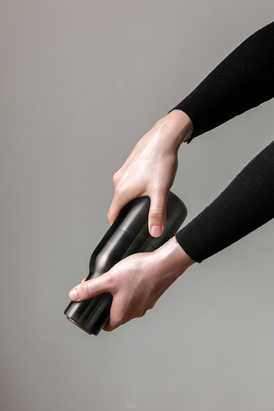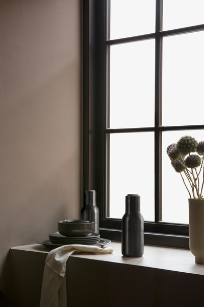 Bottle grinder fra Menu, designet av Norm Architects. En keramisk krydderkvern. Kvernen har en rundet bunn som gir et godt grep. Dekorativ i kjøkkenet, og fine å ta frem under middagen gjennom å fylle dem med alt fra salt og pepper til tørkede krydder og bær.
