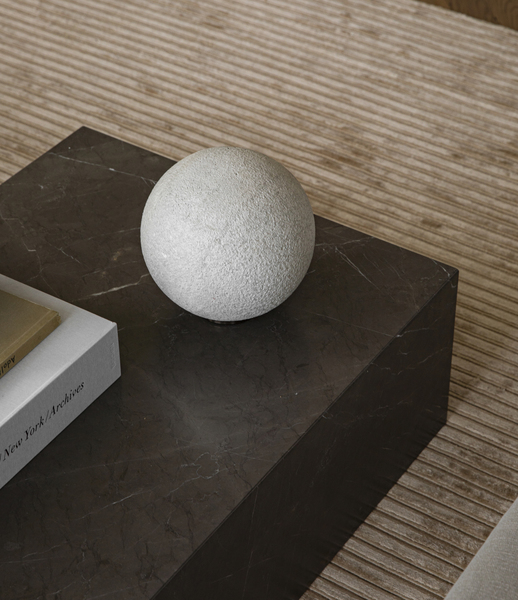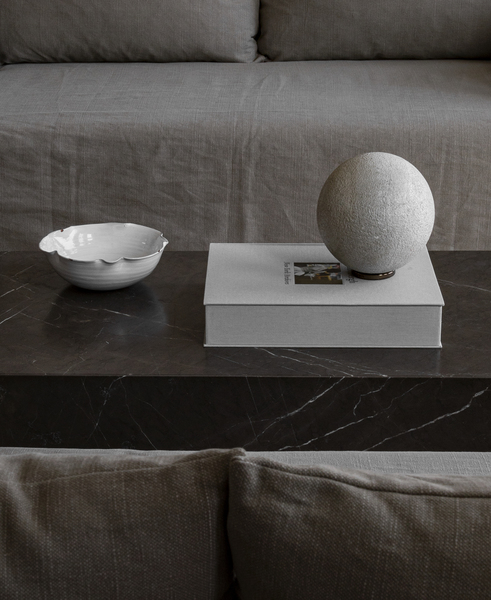 Plinth sofabord fra Menu, designet av Norm Architects. Sofabordet i grå-brun marmor har en ekstraordinær eksklusiv design. Designerne ville skape et bord med multifunksjon som viser frem den unike og vakre marmorens naturlige mønster. Bordet er et riktig stilmøbel som passer utmerket foran sofaen og blir et vakkert blikkfang i rommet.