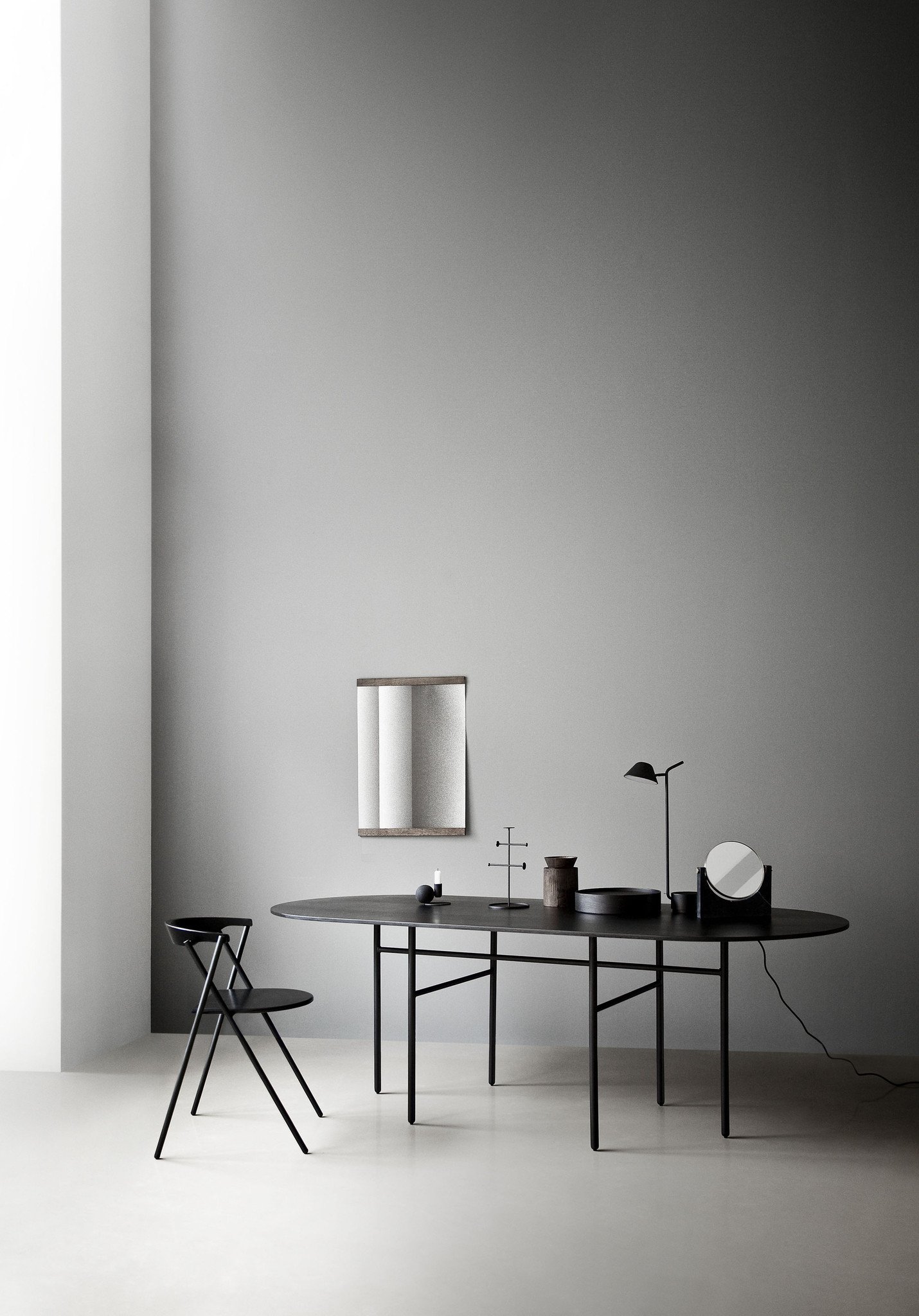 Snaregade Oval bord fra Menu. Dette fantastiske bordet gir et lett og lekent inntrykk. Det har plass til mange middagsgjester og byr inn til lange herlige middager. Bordplaten er produsert i lakkert finér og bena i pulverlakkert stål.