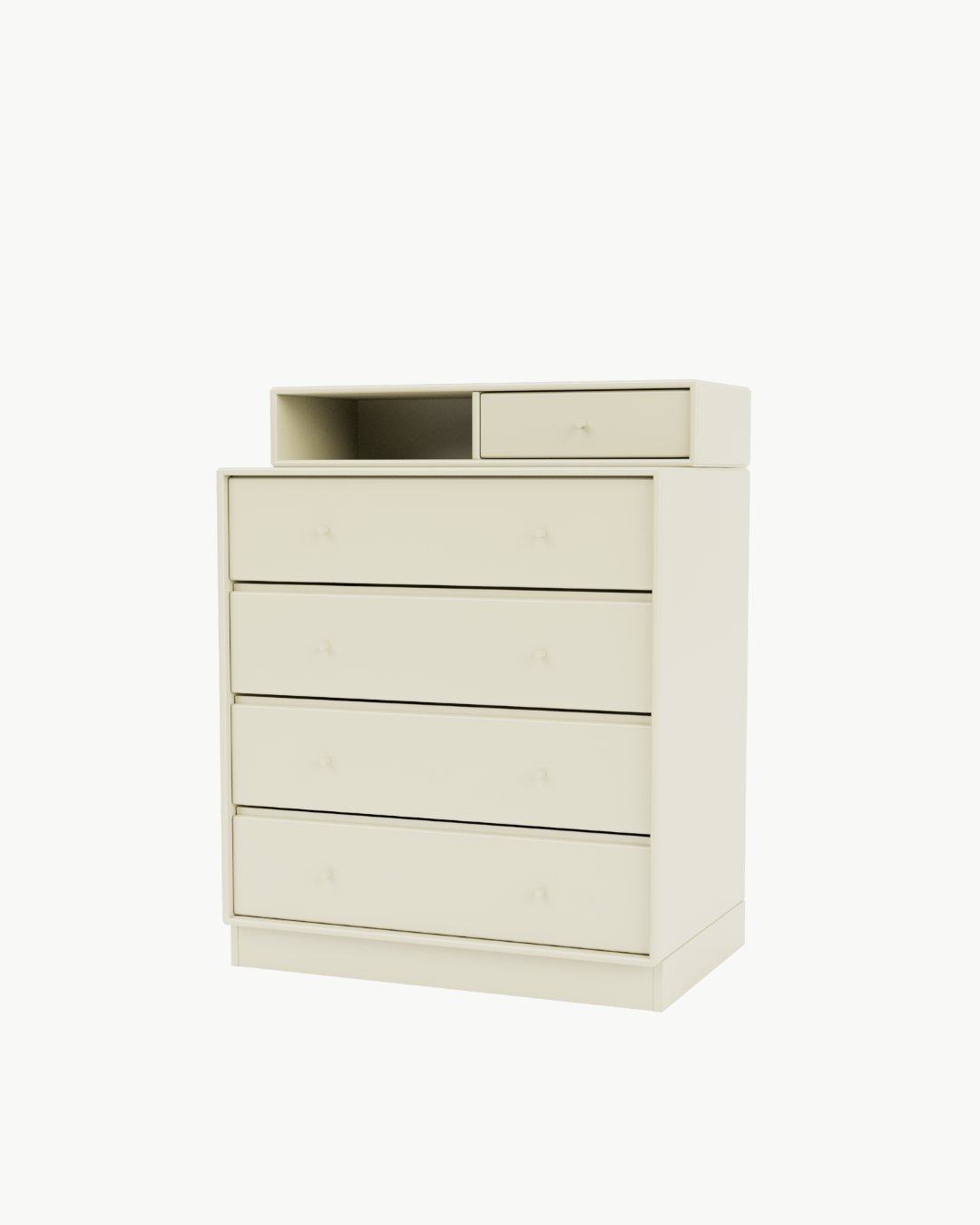 Oppbevar smykker og andre kjære eiendeler i den vakre kommoden KEEP – den perfekte oppbevaringsløsningen for soverom, stue eller entré. KEEP består av en modul med fire skuffer og en mindre modul med én skuff og en åpen hylle.