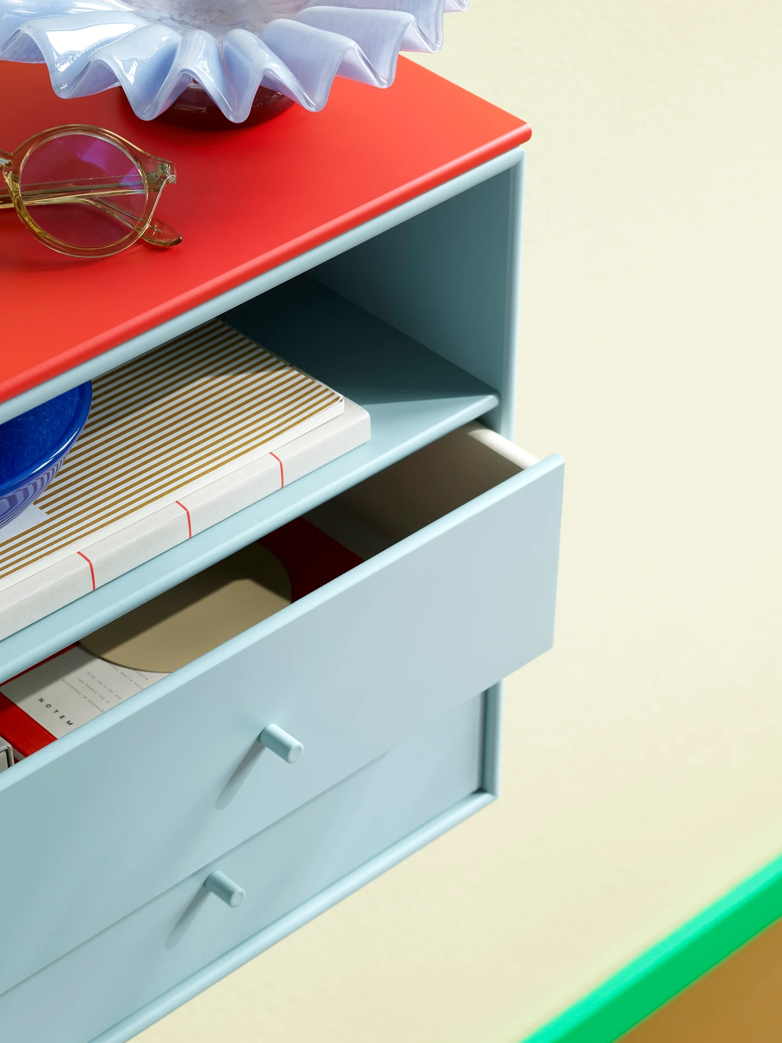 Skuffebakkene leveres i hvitt med fronter lakkert i samme farge som modulens korpus, noe som gir et helhetlig og elegant uttrykk.