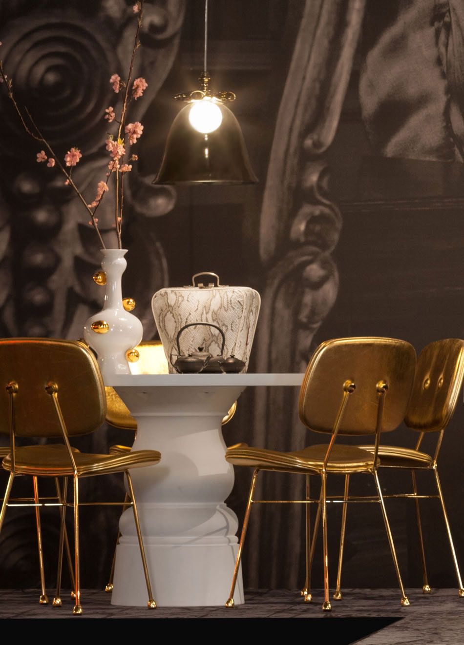 Lampeserien er tilgjengelig i offwhite farge med stål finish eller matt sort farge med messing finish.