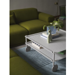 Flow Coffee Table kombinerer industriell eleganse med praktisk design. Laget av støpte metallplater, har dette bordet en unik to-lags struktur og perforeringer for et lett, luftig utseende. Utstyrt med slitesterke gummi- og stålhjul beveger den seg jevnt og stillegående, og er egnet for både innendørs og utendørs bruk.