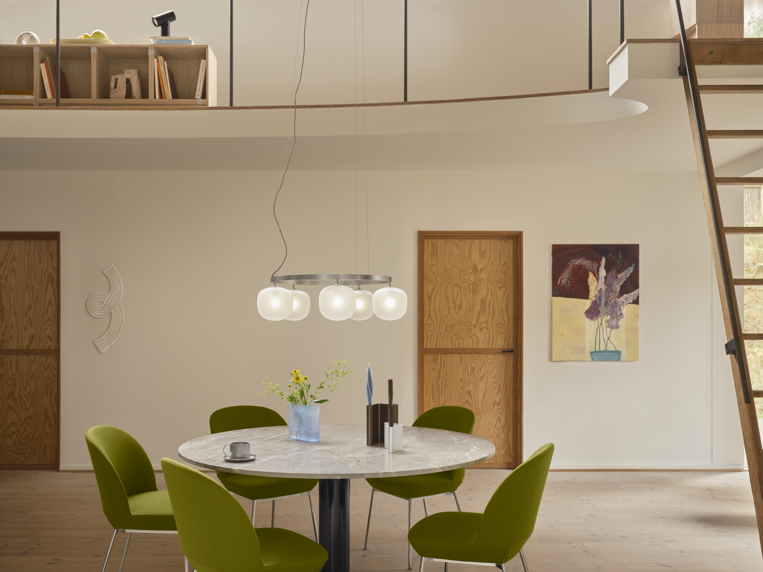Rime Chandelier gjenskaper den klassiske glasspendelen som en slående lysskulptur. Med fem munnblåste, sandblåste glassskjermer kaster den en myk, raffinert glød, mens det firkantede aluminiumsopphenget gir en skarp, arkitektonisk kontrast. Designet for høye tak, gir den et dristig inntrykk over runde bord og spiseområder. Synlige skruer og industrielle overflater – hvit, svart eller aluminiumsgrå – fremhever dens moderne karakter. Hver skjerm inkluderer en G9-pære av høy kvalitet med en fargegjengivelsesindeks over 90 for varm og jevn belysning. Glassskjermer, oppheng og kabler kan alle byttes ut for varig holdbarhet.