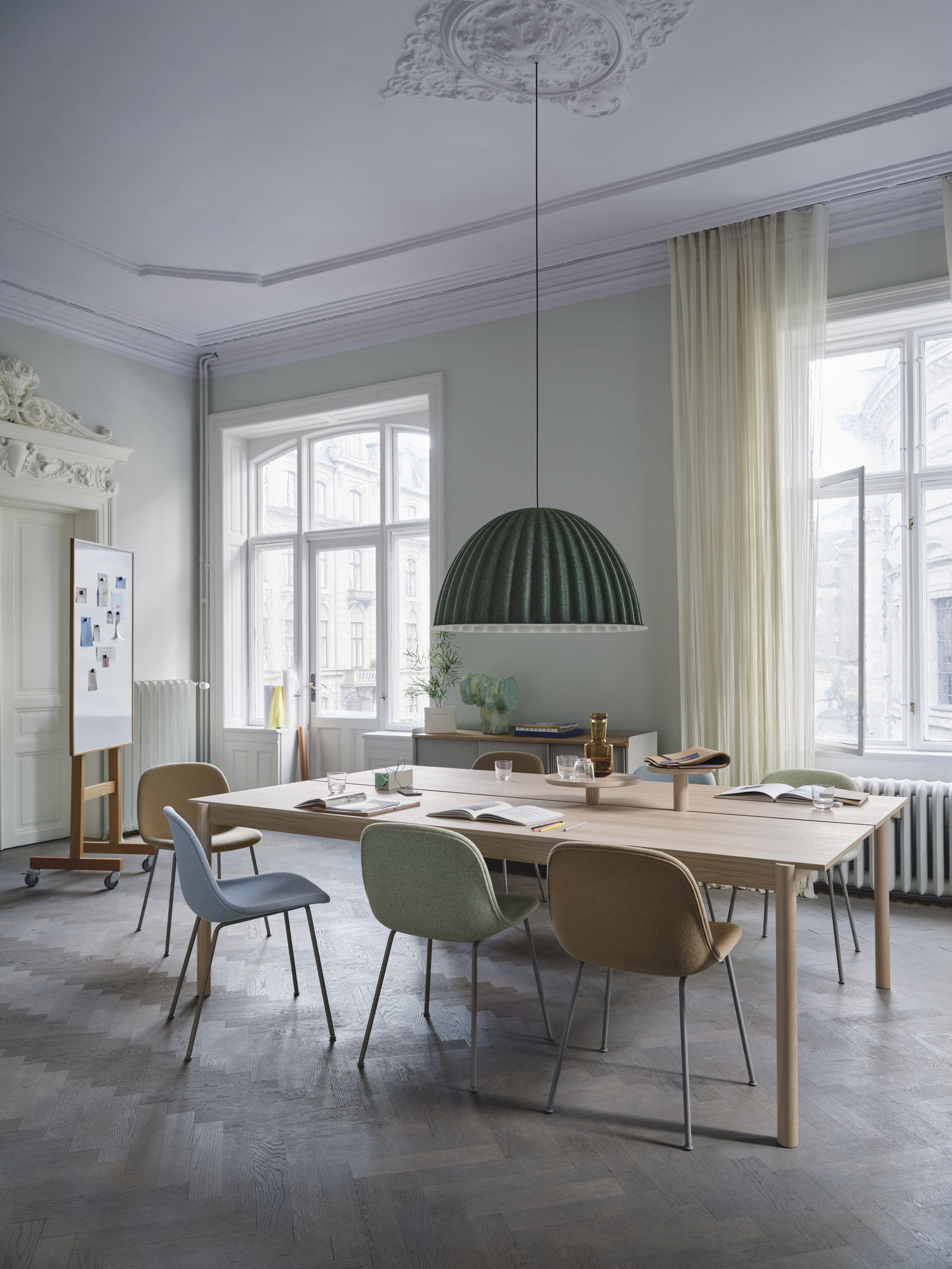 Under the bell er en taklampe fra Muuto, design Iskos-Berlin. Duon nedstammer fra København, som kommer frem i designen. Denne fantastiske lampen er produsert i resirkulert plast og gir et vakkert lys og bidrar også til forbedret akustikk i rommet. Lampen skaper sin egen plass med en diameter på 82 cm. Maks. 30 watt.