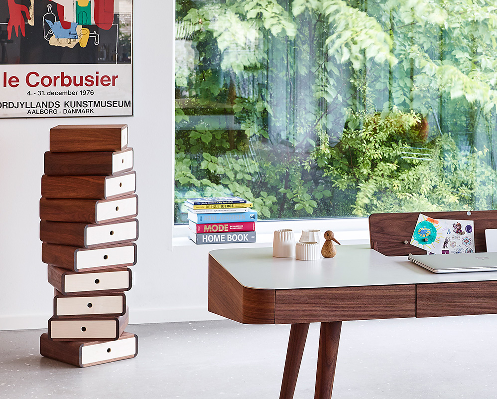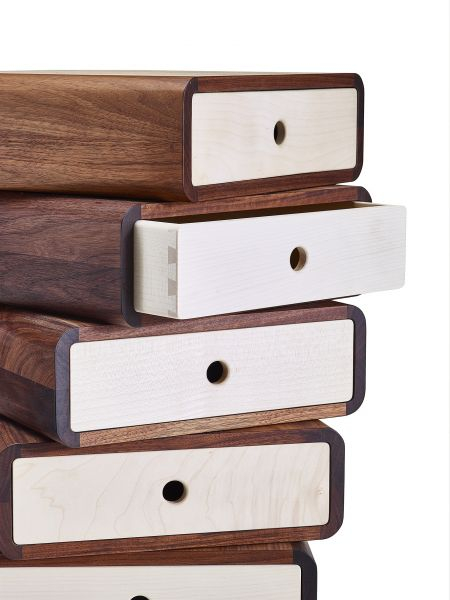 Skuffetårnet Turning Boxes består av 10 bokser med skuffer som hver kan snu 360 grader. Ideen bak designet var å lage et skulpturelt og dekorativt møbel som kan endres for å passe omgivelsene og innbyr til en lekende tilnærming til hjemmet. Det lar deg lage et unikt og funksjonelt møbel som passer nøyaktig til ens individuelle behov. Kombinasjonen av amerikansk, mørk valnøtt og dansk, lys lønn fremhever strukturene vakkert og gir Turning Boxes et eksklusivt uttrykk.
