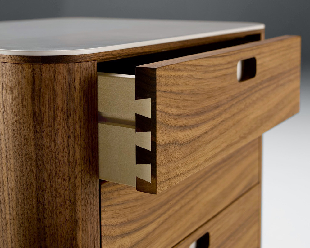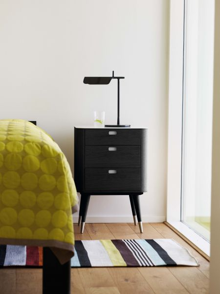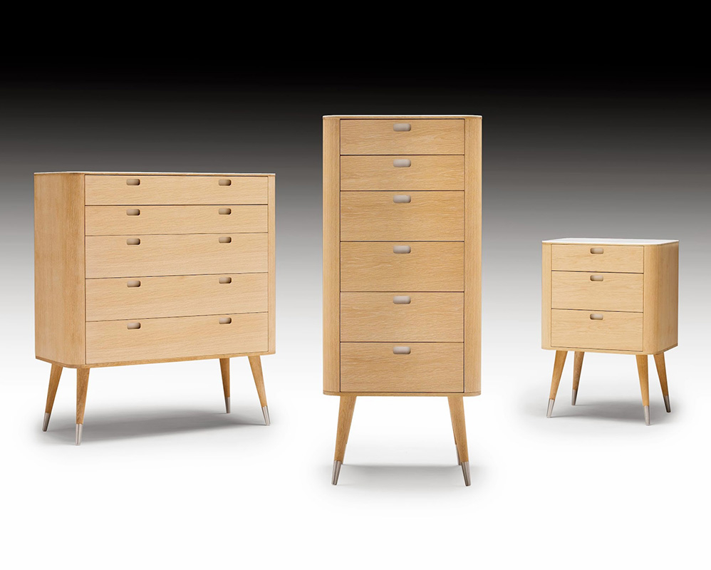 Kommoder kan stå fritt i rommet. Skuffene er med lønnesider og glidelås sammen.
