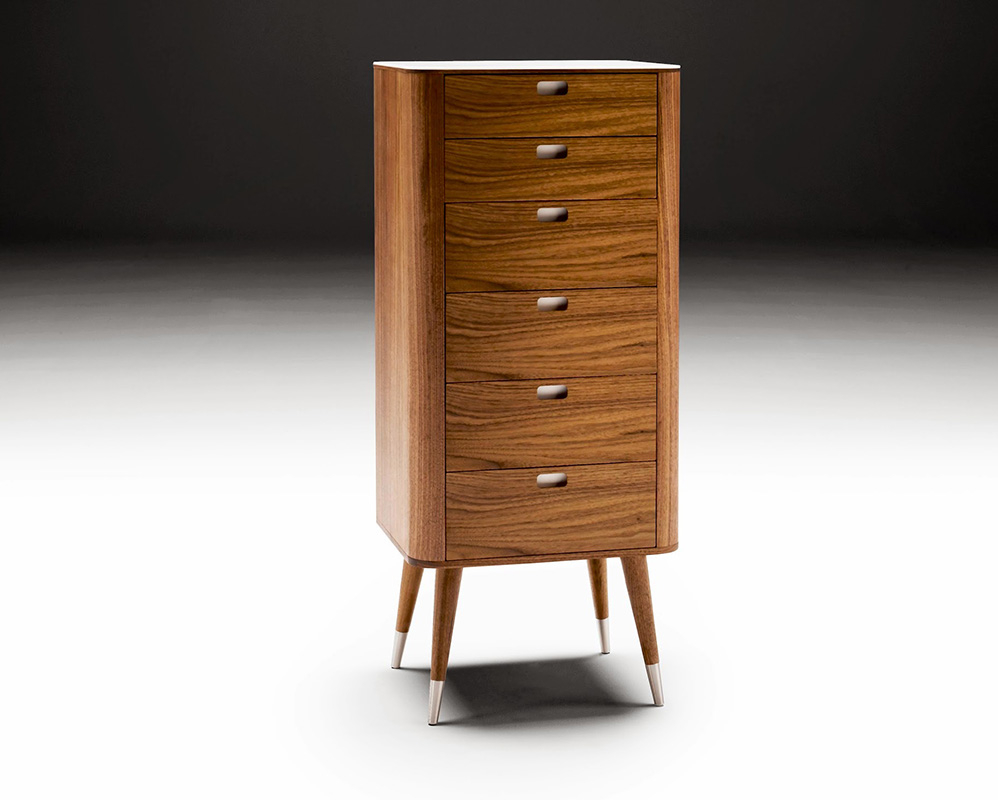 Kommoder kan stå fritt i rommet. Skuffene er med lønnesider og glidelås sammen.