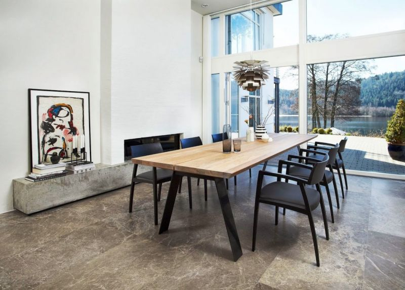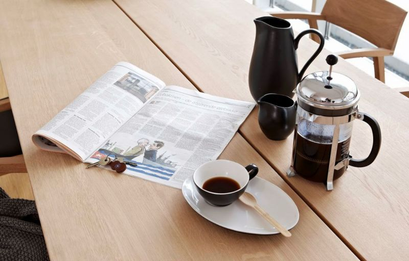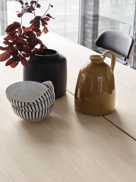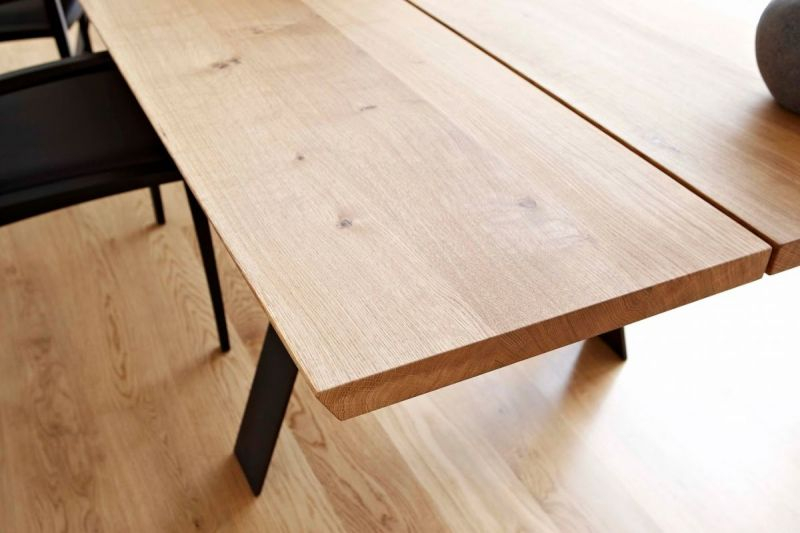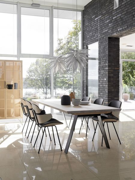 Bordplaten er i massivt tre i 40 mm tykkelse. Bena er laget av svart pulverlakkert stål.