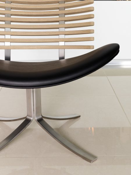 Gepard lenestol i tre, rustfritt stål og med polstret sete. Stolen er laget med fokus på menneskelige naturlige sitte behov, uten å gå på akkord med et elegant uttrykk. Gepard-stolen er utstyrt med returdreie.