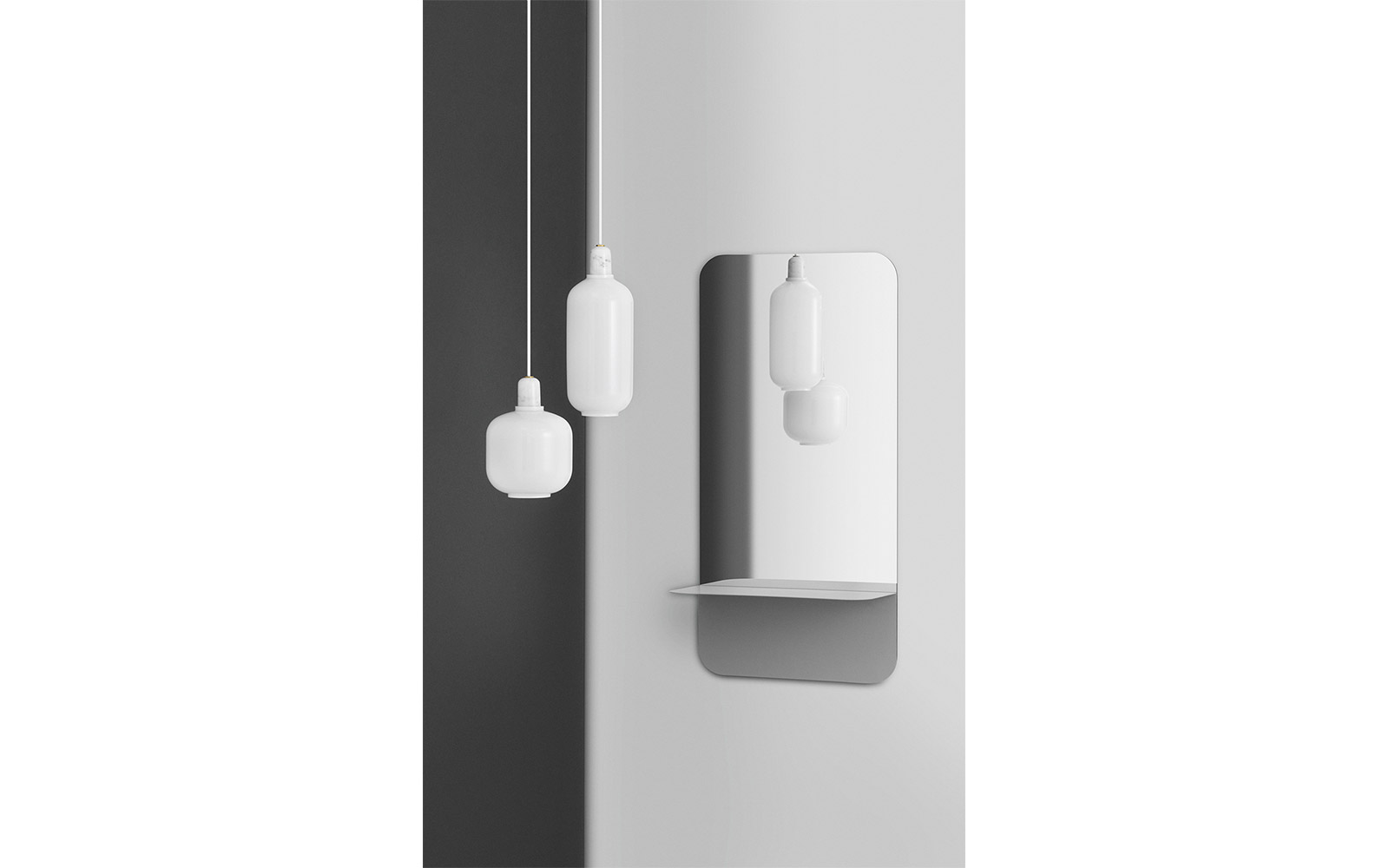 Amp lamp er designet av Simon Legald for Normann Copenhagen. Lampene kjennetegnes ved at materialet glass og marmor gir en kombinasjonen av visuell skjørhet og en sanselig tyngde. Det er brukt materiale av høy kvalitet. Proporsjonene for hver lampe har blitt nøye designet for å sikre den rette balansen mellom hardt og mykt og gjennomsiktig og ugjennomsiktig. Amp lampene kommer med matchende stoffledning på 4 meter. Hvitfarget glass og messing. NB: Inkluderer ikke krok til oppheng.