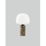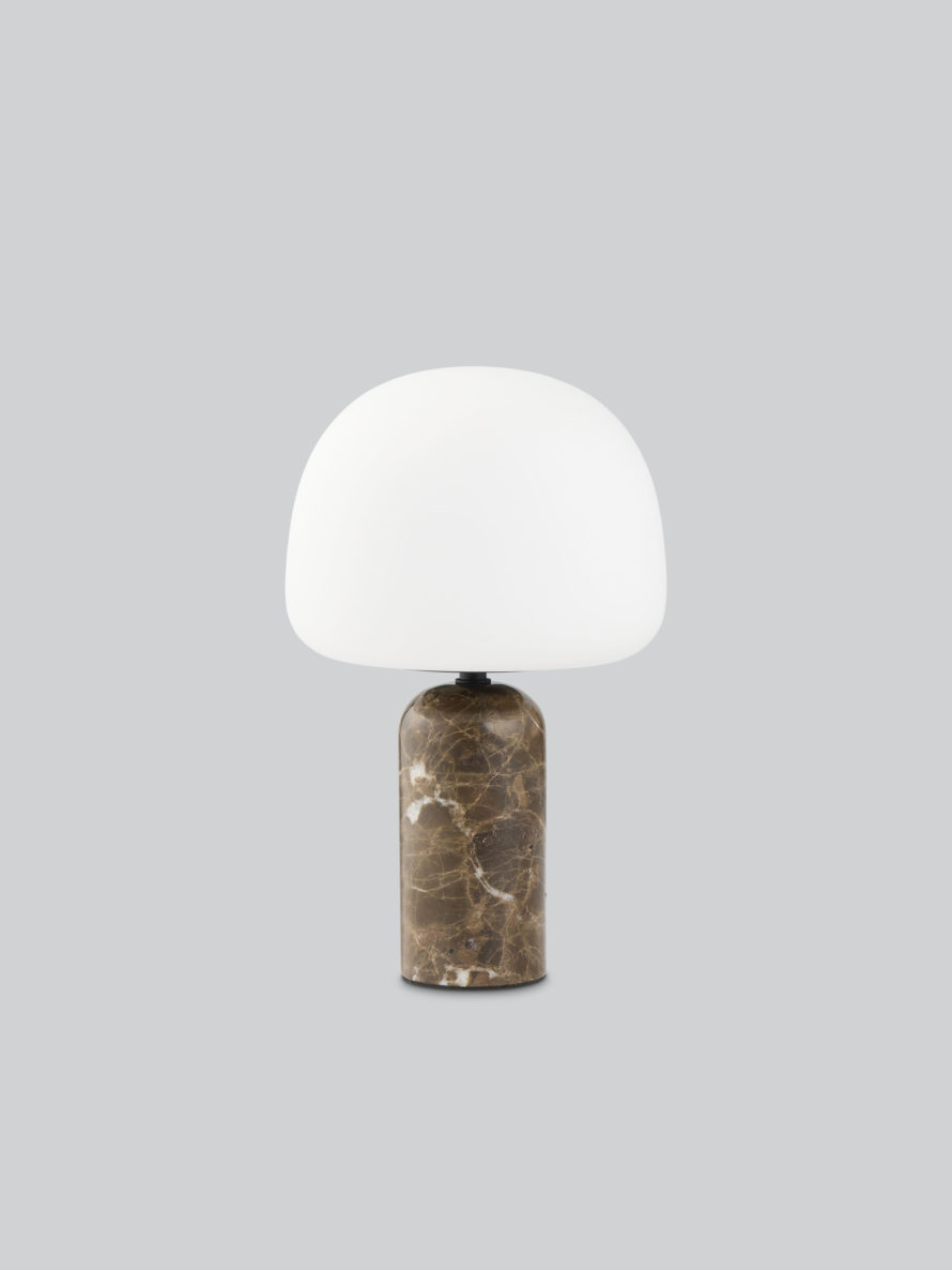 Denne hodevenderen av et lys henter signalene fra formen til bobblehead-figurer som kan samles, med sin overdimensjonerte munnblåste, matte opalglassskjerm som sitter uanstrengt på toppen av den mykt avrundede polerte Emperador-marmorbasen.