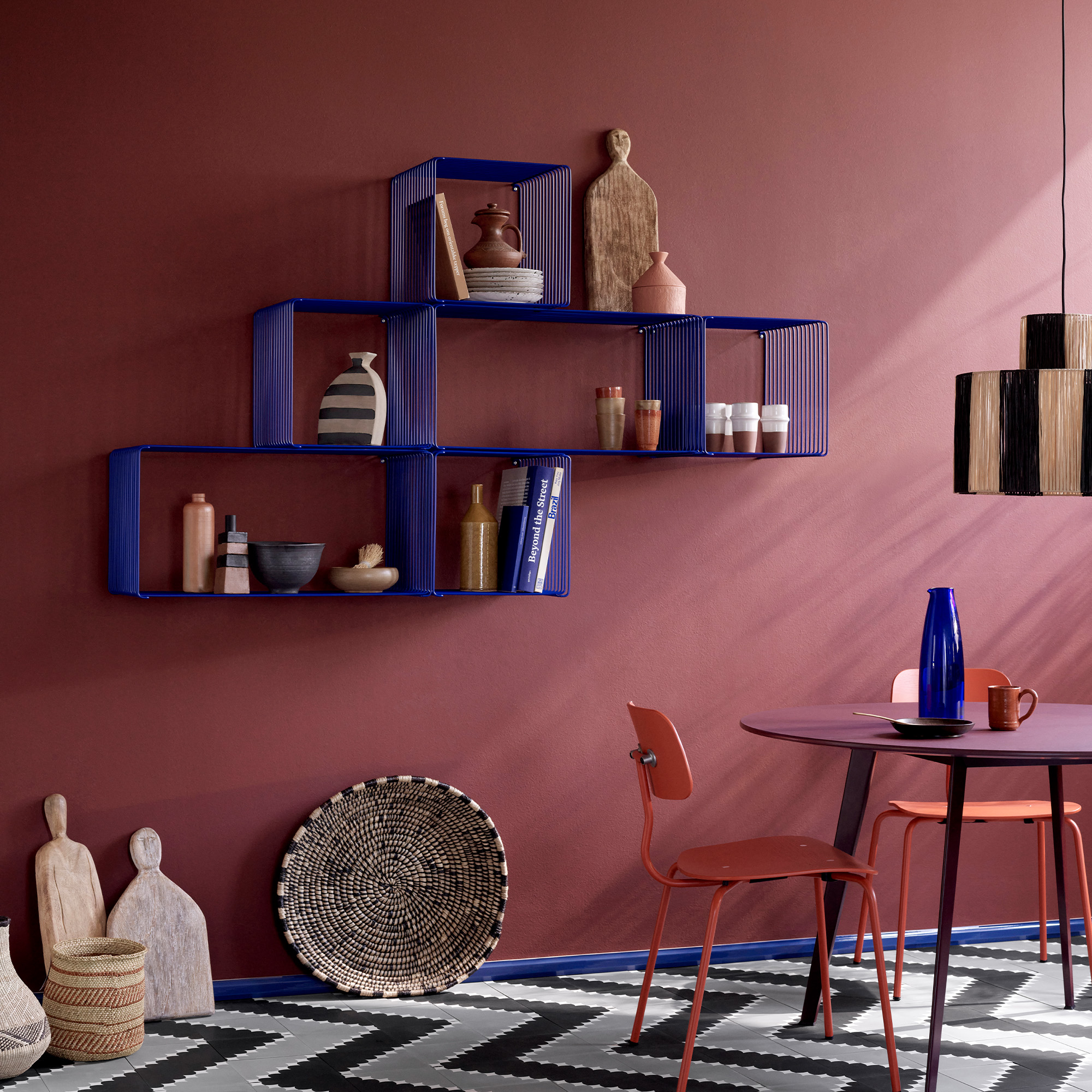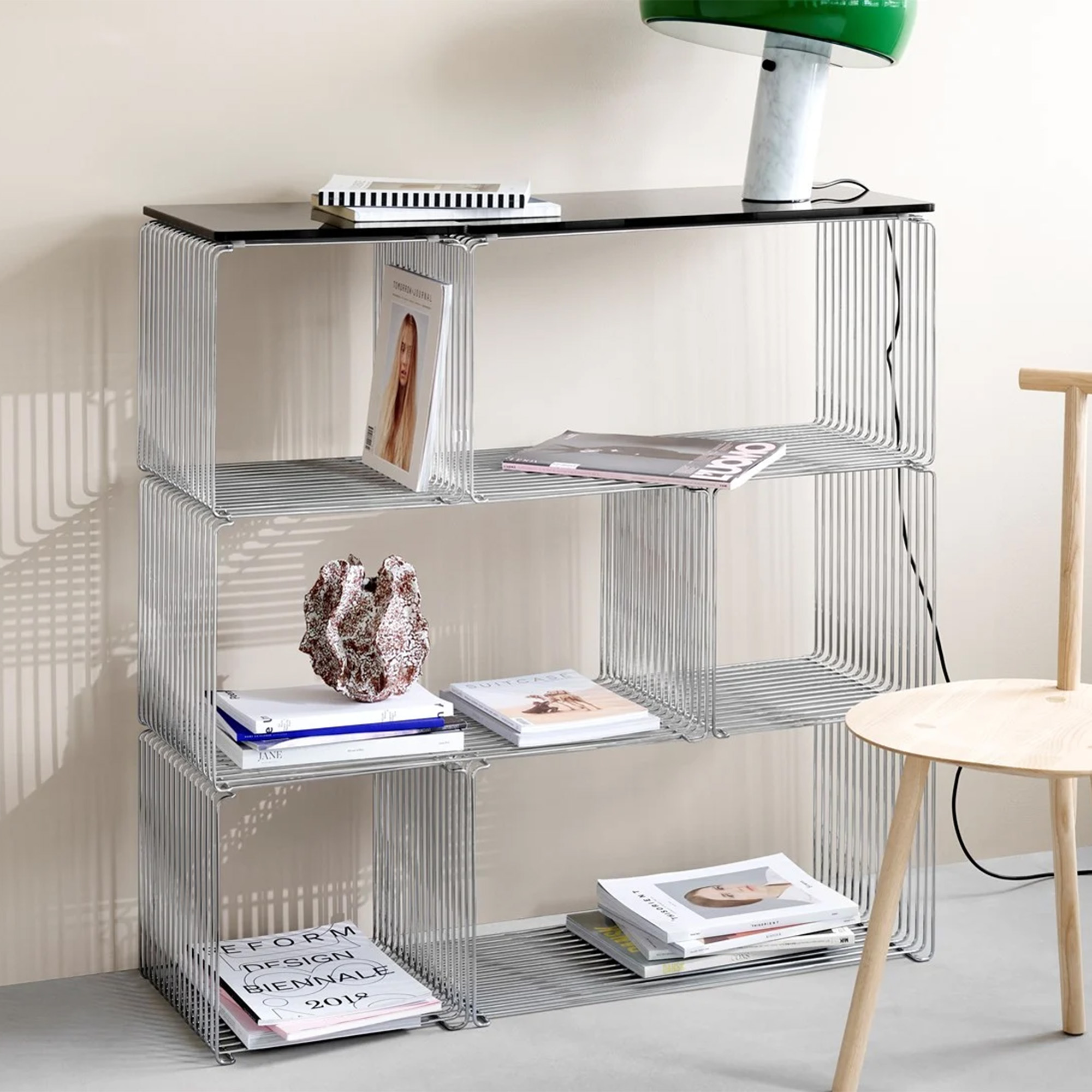 Panton Wire Extended kan brukes alene eller kombineres med andre moduler i Panton Wire-serien. Den fungerer like godt stående på gulvet, hengende på veggen eller som en åpen romdeler. Bruk den som et sofabord med en topp-plate i stuen, eller som praktisk oppbevaring for bøker, magasiner og elektronikk.