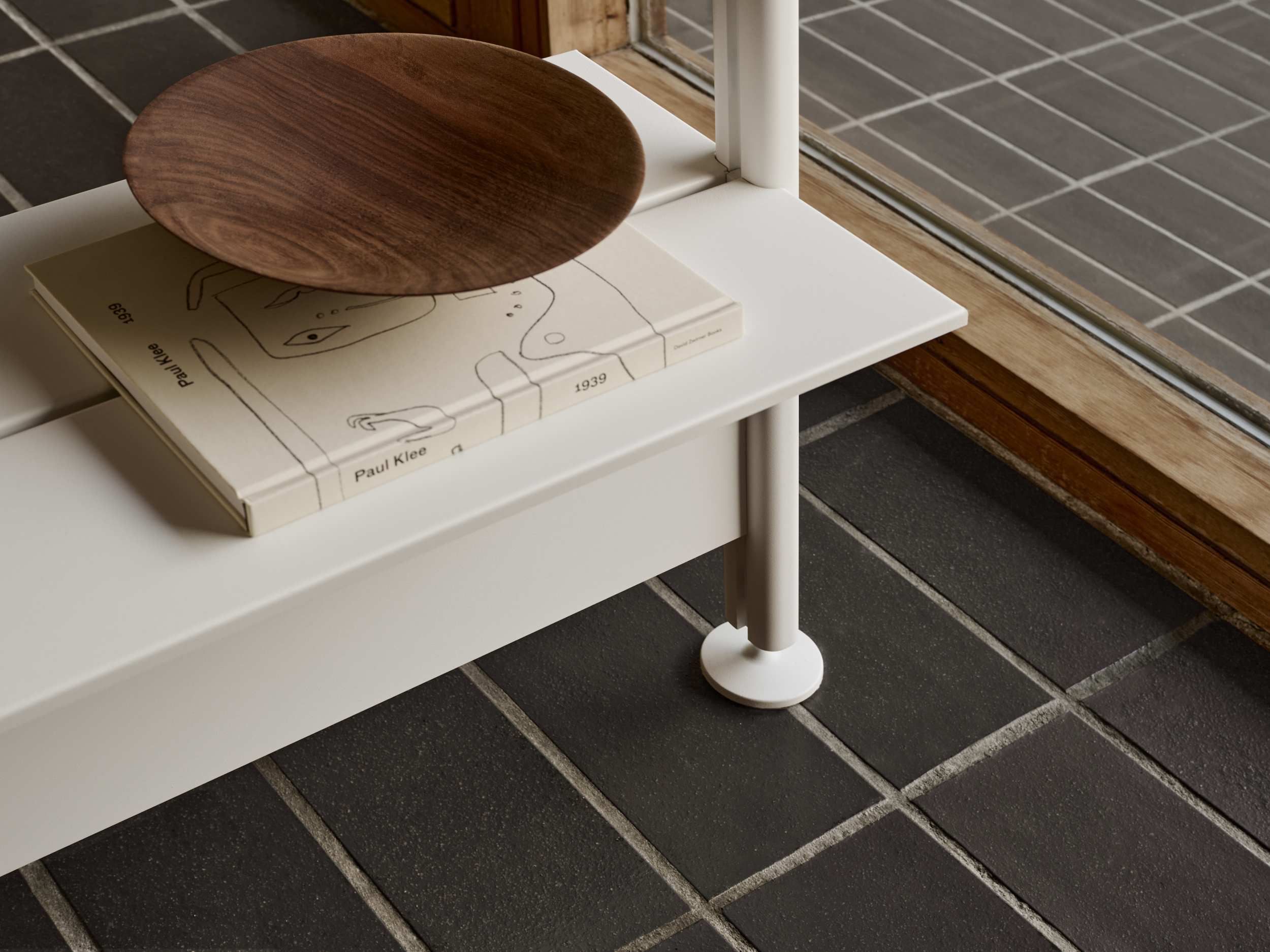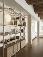Hyllesystemet kombinerer treverk, lakkerte stålhyller og slanke aluminiumsstolper, noe som gir et uttrykk som både er robust og elegant.