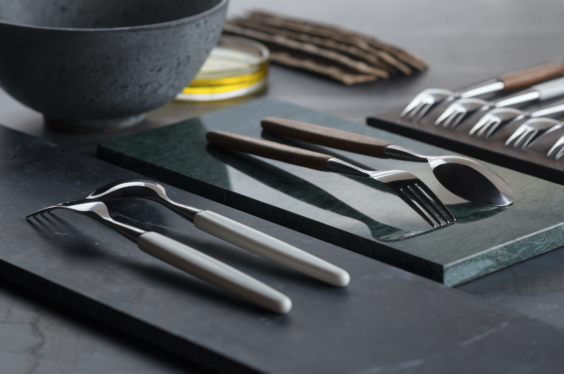 Skaugums design fra 1946 legger vekt på at bestikket både skal være godt å spise med og å holde i hånden. Det håndsmidde bestikket kommer i tre farger med plastskaft samt to versjoner med treskaft. Dette var opprinnelig i teak og palisander, men palisander ble senere erstattet med Kebony, et spesialbehandlet norsk trevirke.