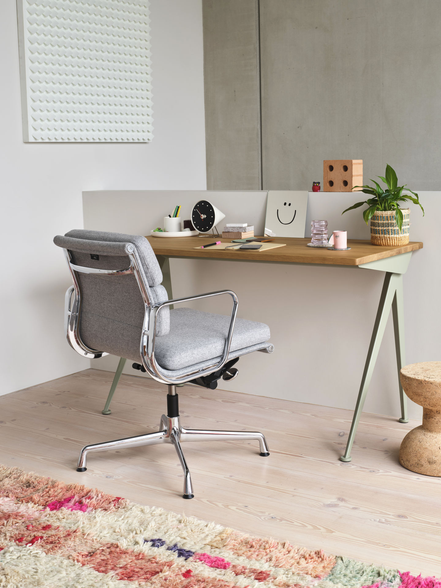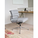 Soft Pad Chair EA 231 er utstyrt med en justerbar vippemekanisme og en oppreist setevinkel tilpasset skrivebordsarbeid. Designet uten hjul, ligner den ikke på en typisk arbeidsstol, og dens uformelle innbydende utseende er et perfekt tillegg til ethvert velutstyrt hjemmekontor.