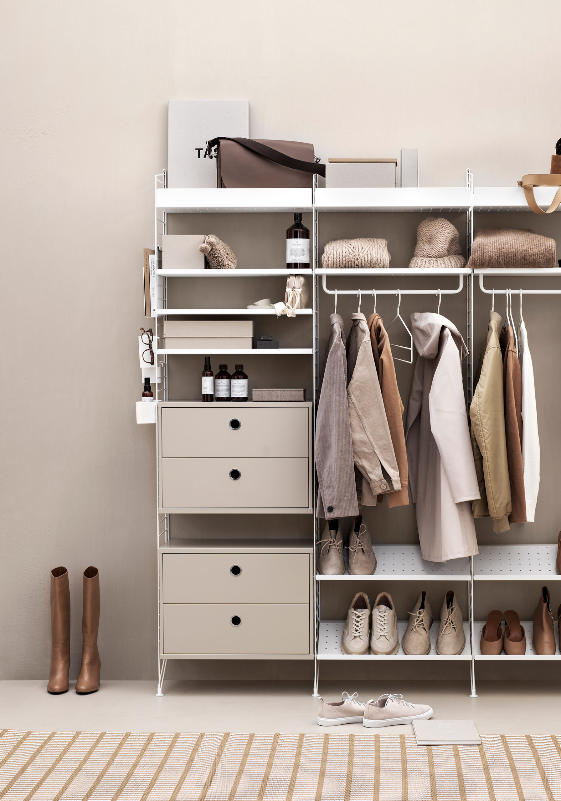 Stikkord: gang, garderobe, hyller, hyllesystem, klesstativ, møbler, string, string gang, string oppsett