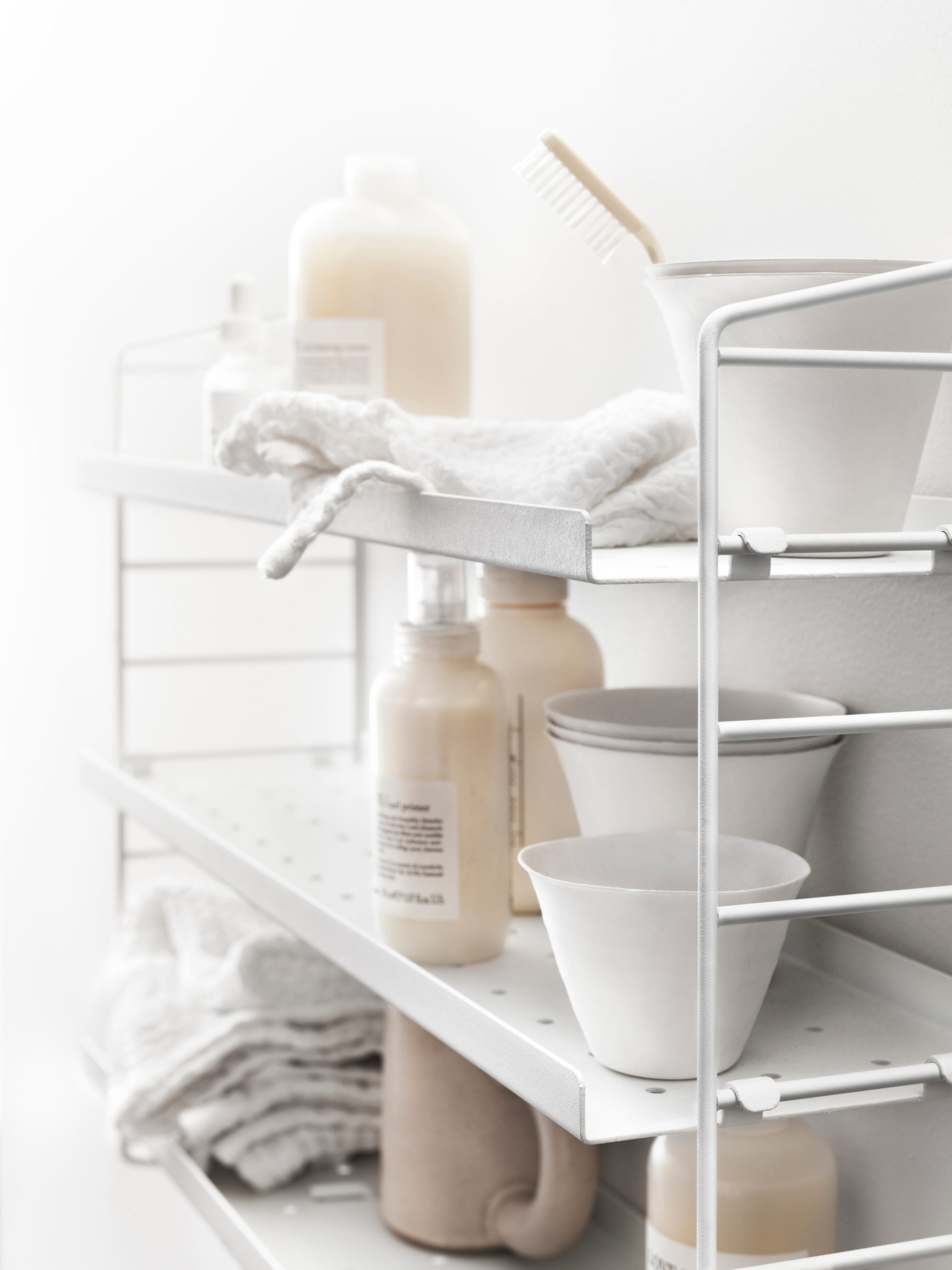 Når du trenger noe diskret og elegant, vil denne vegghengte 20 cm dype String-løsningen gjøre susen. Hyllene i metall åpner også opp muligheten for senere å bygge på med tilbehør som kroker og stenger.