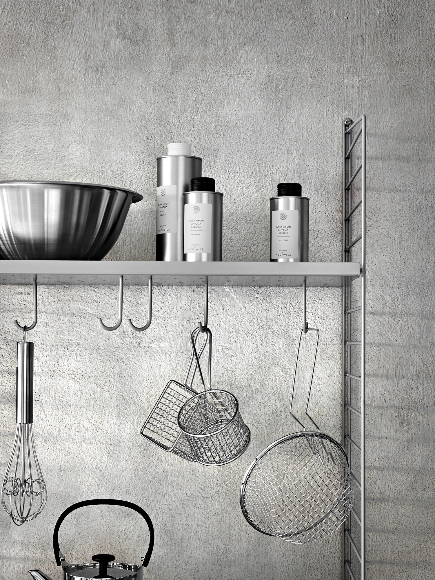 Denne vegghengte String-løsningen med metallhyller i to seksjoner, er perfekt for oppbevaring av kjøkkenutstyr. Bruk krokene til å henge opp diverse kjøkkenutstyr eller kjøkkenhåndklær.