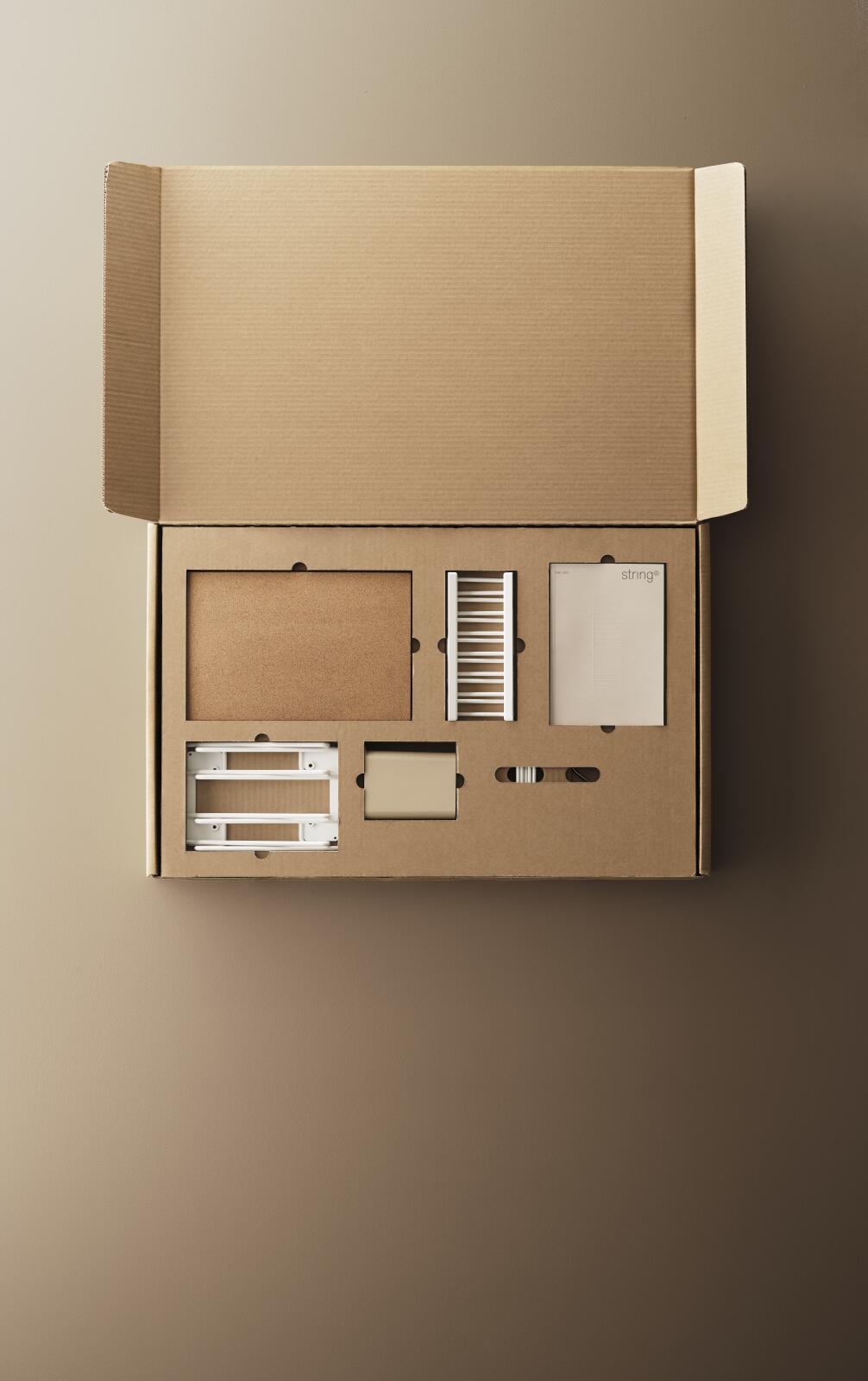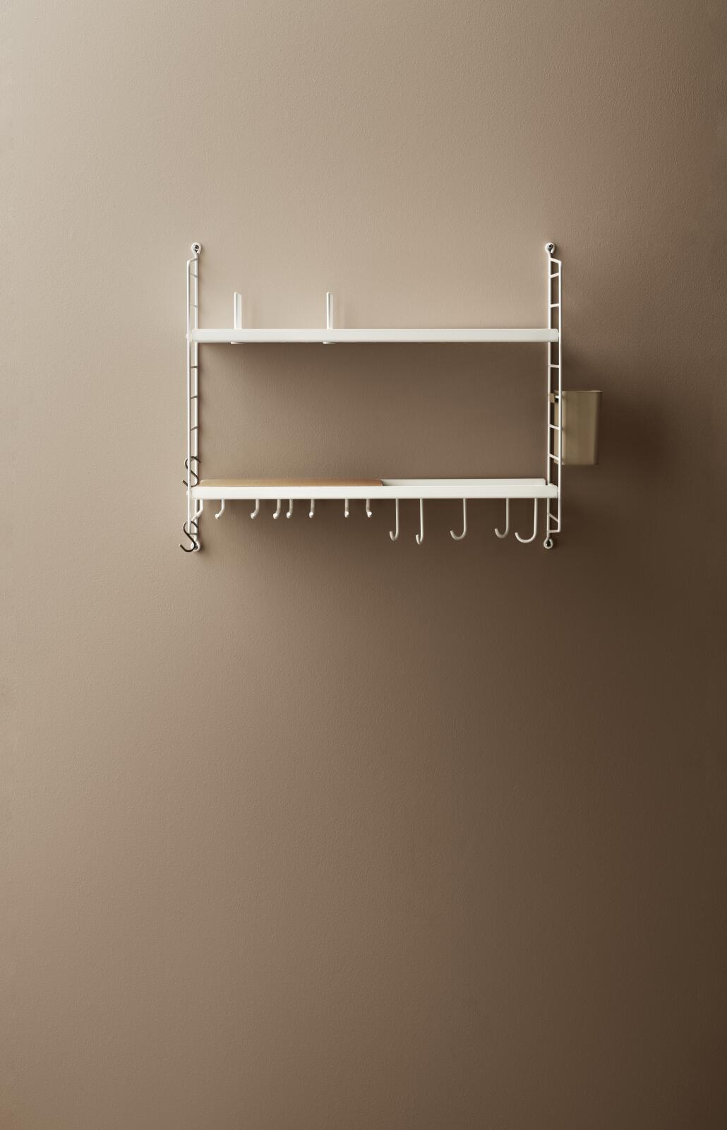 Med et mindre kjøkken i tankene har String Furniture samlet det viktigste i én eske. Følgende produkter er inkludert: To gavler H50 x D20 cm i hvitt, to metallhyller med lav kant B58 x D30 cm i hvitt, ett tallerkenstativ D20 cm i hvitt, to glasshengere D20 cm i hvitt, ett underlag B19,3 x D29,6 x H1,85 cm i kork, én organizer-boks B9 x D7 x H12 cm i beige, fem kroker i hvitt samt to s-kroker i rustfritt stål.