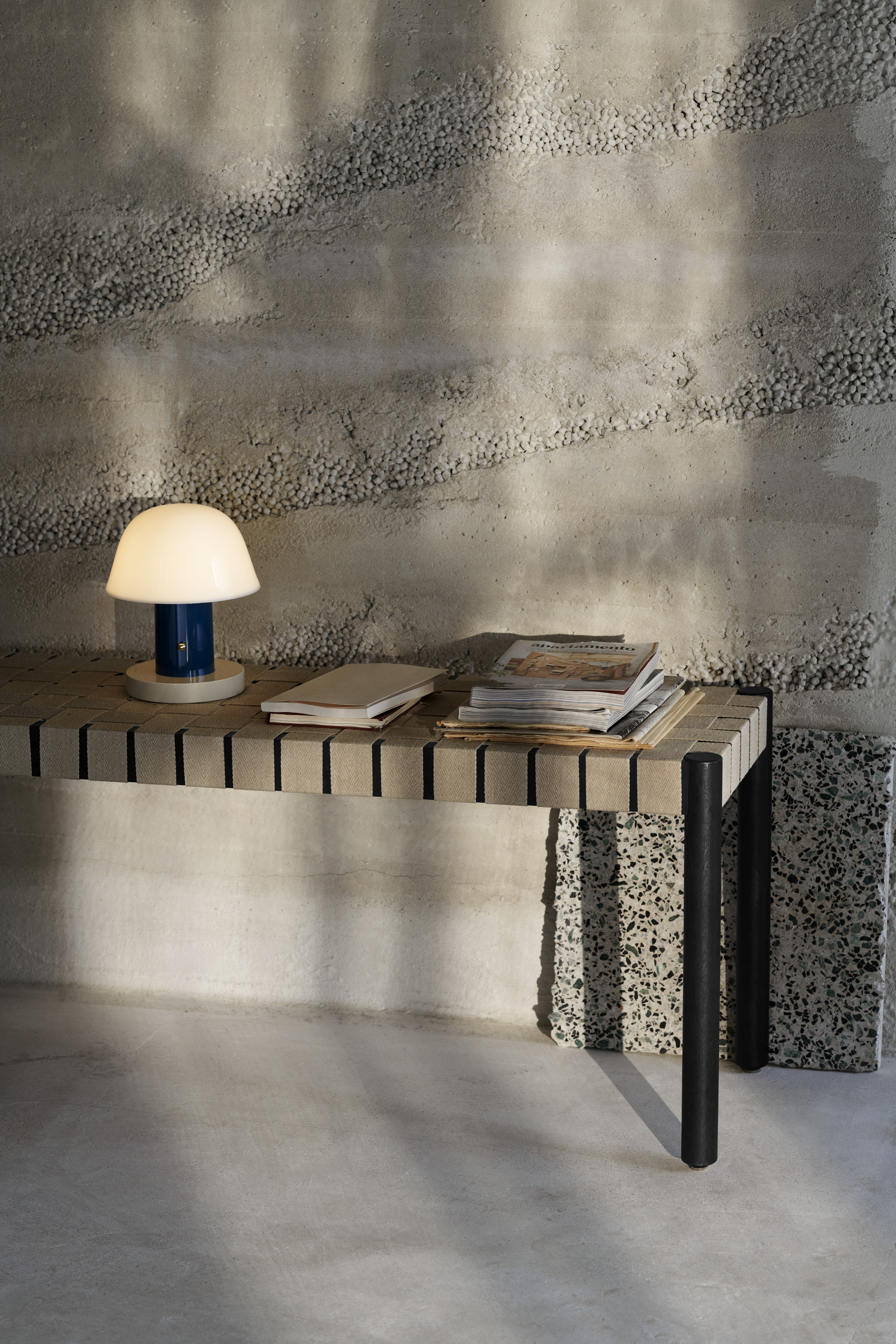 Thomas Bentzens bærbare sidebord er treffende kalt ‘Don’t Leave Me’. Forkortet til DLM, og har et praktisk håndtak som gjør det mulig å bære metallbordet fra rom til rom. Selv om det har en lett og bærbar struktur, gir de tre skrå beina stor stabilitet. DLM og DLM XL, som er tilgjengelige i to størrelser, gir funksjonelle alternativer til tradisjonelle salongbord. Passer for innvendig bruk i de fleste hjemme- eller kontormiljøer.