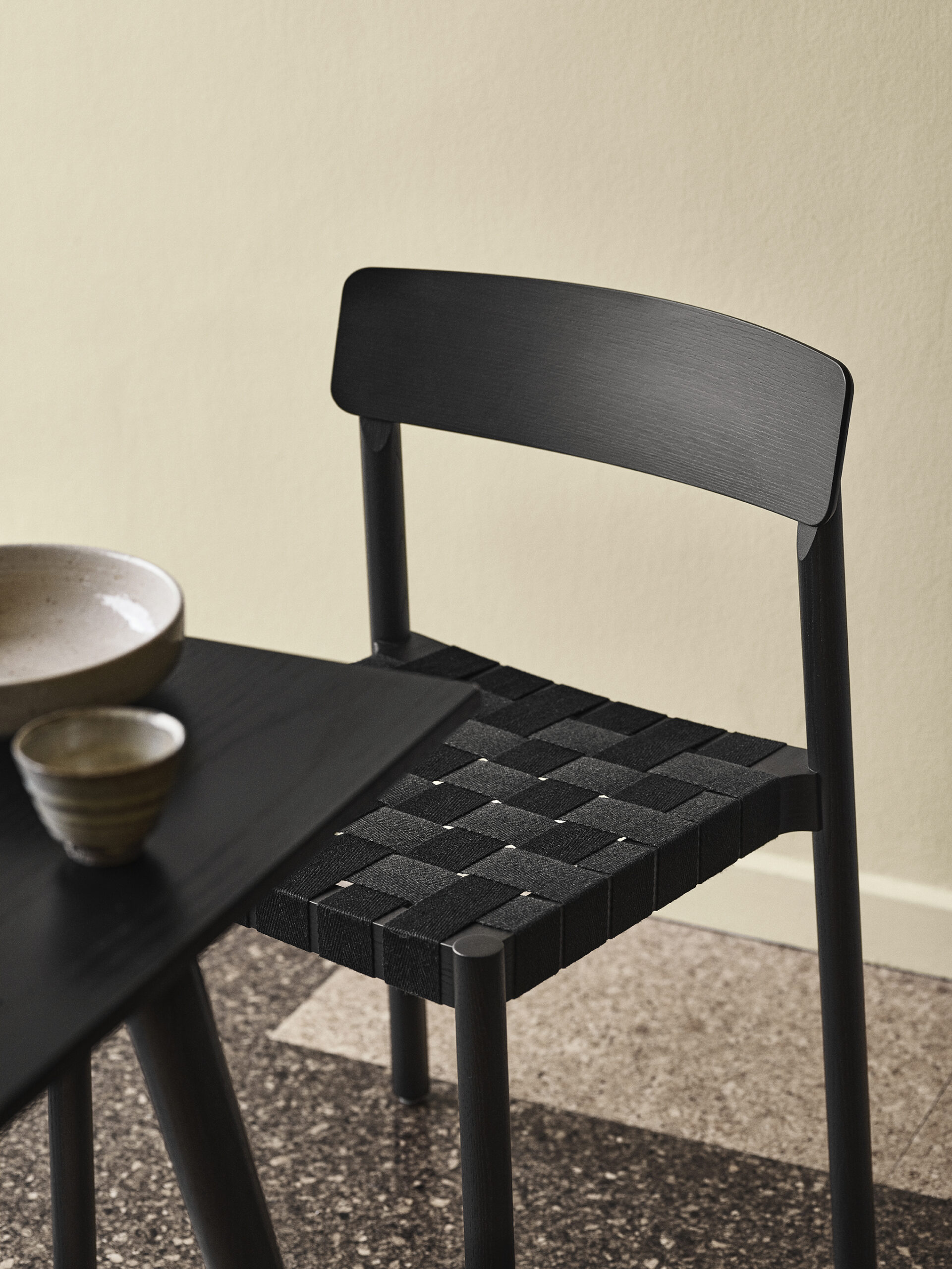 Oppkalt etter Betty Nansen-teatret i København, kommer denne stablebare stolen i to versjoner: en med et solid tresete, og en annen med et sete laget av synlige bånd laget av naturlige linfibre.