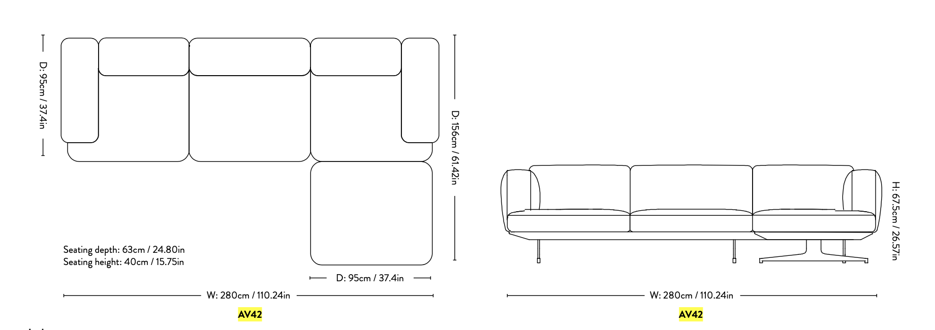 Ramme i tre, HR-skum, dyner, polyesterpolstring og ben i pulverlakkert eller polert aluminium. |