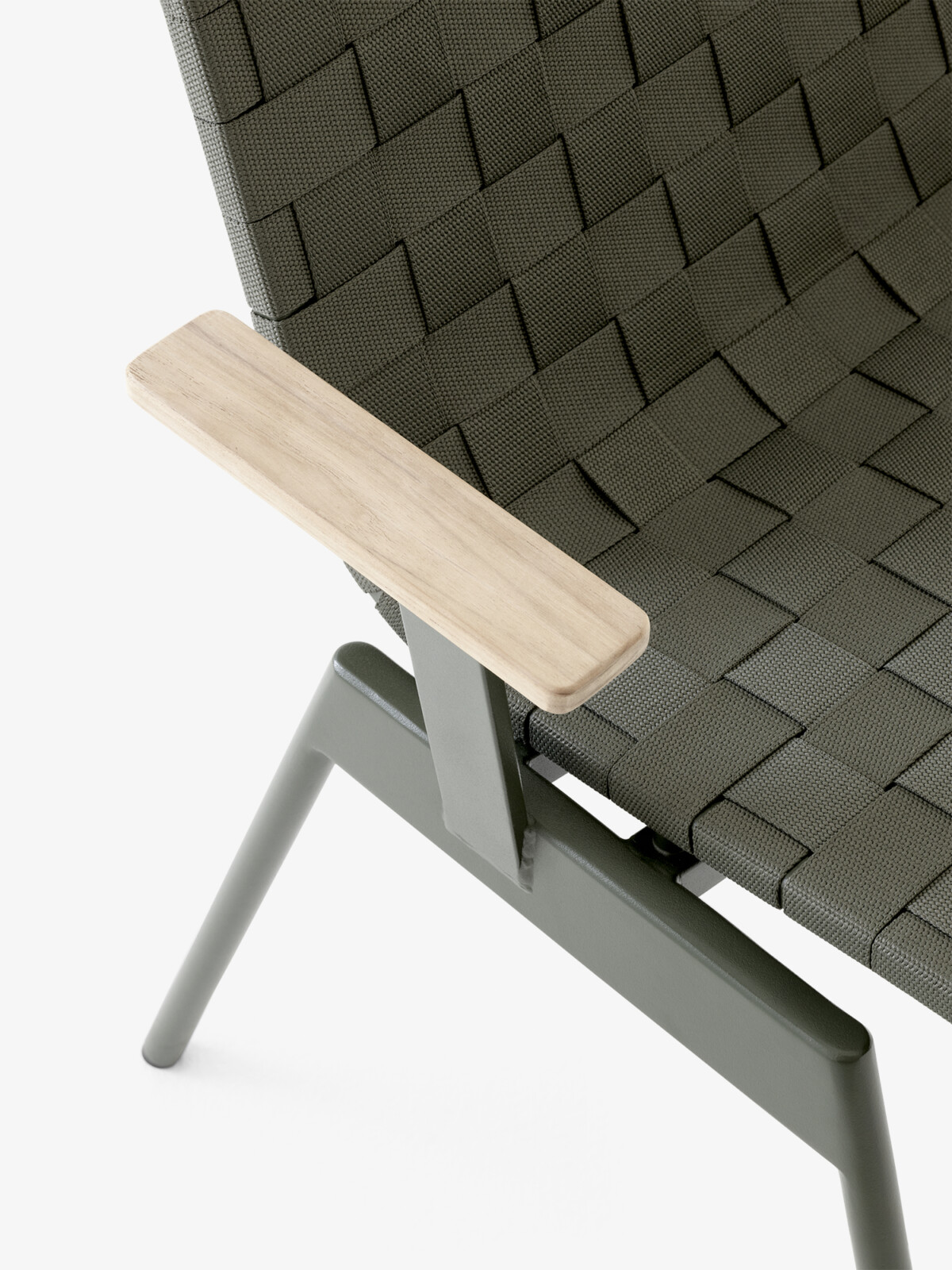 Stolen Ville Outdoor AV34 fra &Tradition er laget av polyesterbånd og tre. Stolen er designet av Anderssen & Voll og tilpasser seg kroppstemperaturen for optimal komfort i all slags vær. Armlenene i tre gir en innbydende følelse og skaper en visuell sammenheng.