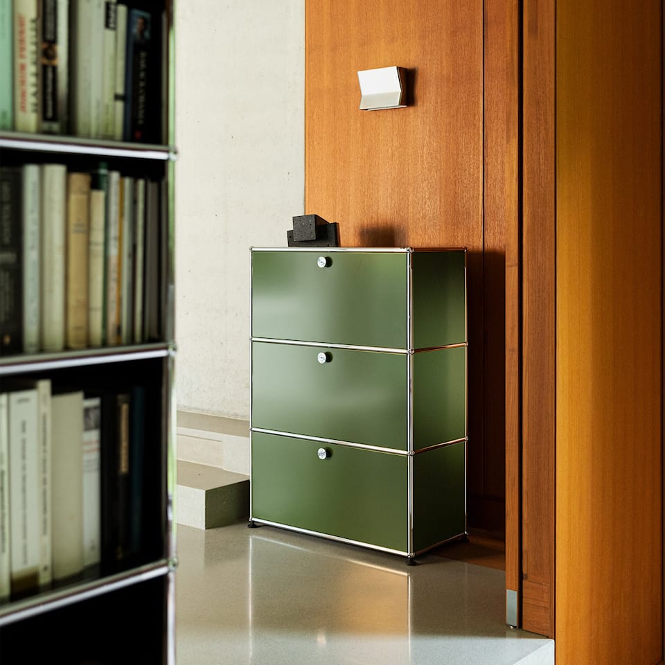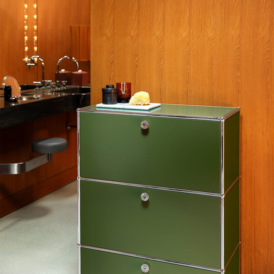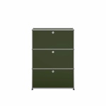 USM Haller Highboard Olive Green er en et tidløst oppbevaringsskap fra USM designet av designerne Fritz Haller og Paul Schärer. Den leveres med tre foldedører og er laget av forkrommede metallrør som danner rammen som de lakkerte metallplatene hviler på. Oppbevaringsskapet er konstruert av tre grunnleggende elementer: kulen, forbindelsesrør og paneler. Systemet kan bygges i alle retninger, demonteres og rekonfigureres. Modulene kan tilpasses ytterligere ved å legge til dører, skuffer og en rekke beslag for enkel organisering.