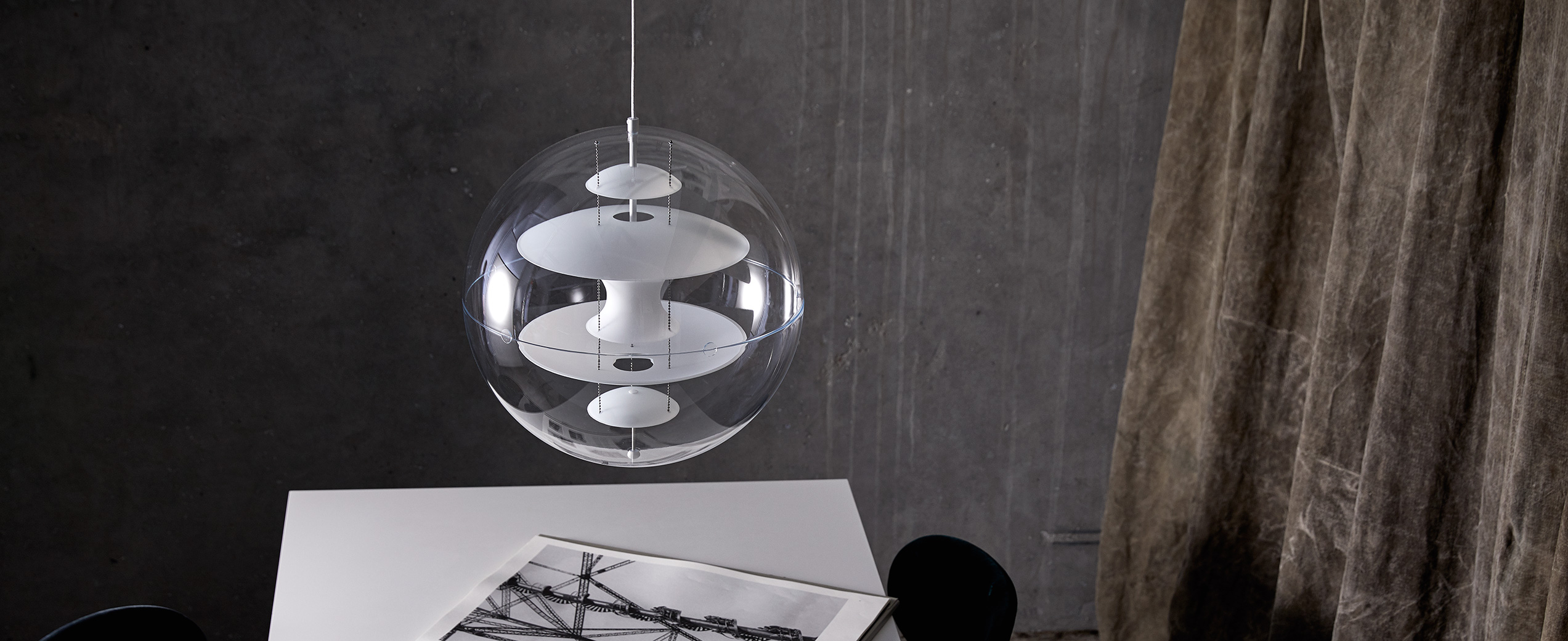 i opalt hvitt glass suspendert av tre stålkjeder