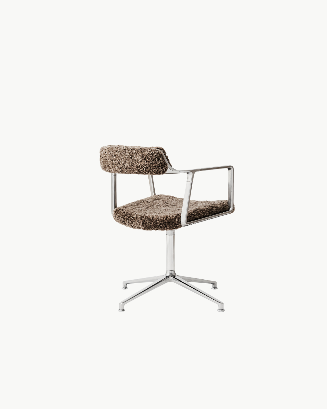 Den spesialdesignede Swivel Chair Curly Edition fra Vipp kombinerer industriell eleganse med myk komfort. En slank, polert aluminiumsramme møter tett og eksklusiv polstring laget av mykt australsk saueskinn i en varm umber-nyanse. Resultatet er en stilfull og funksjonell kontorstol som passer perfekt til både hjemmekontor og profesjonelle møterom.