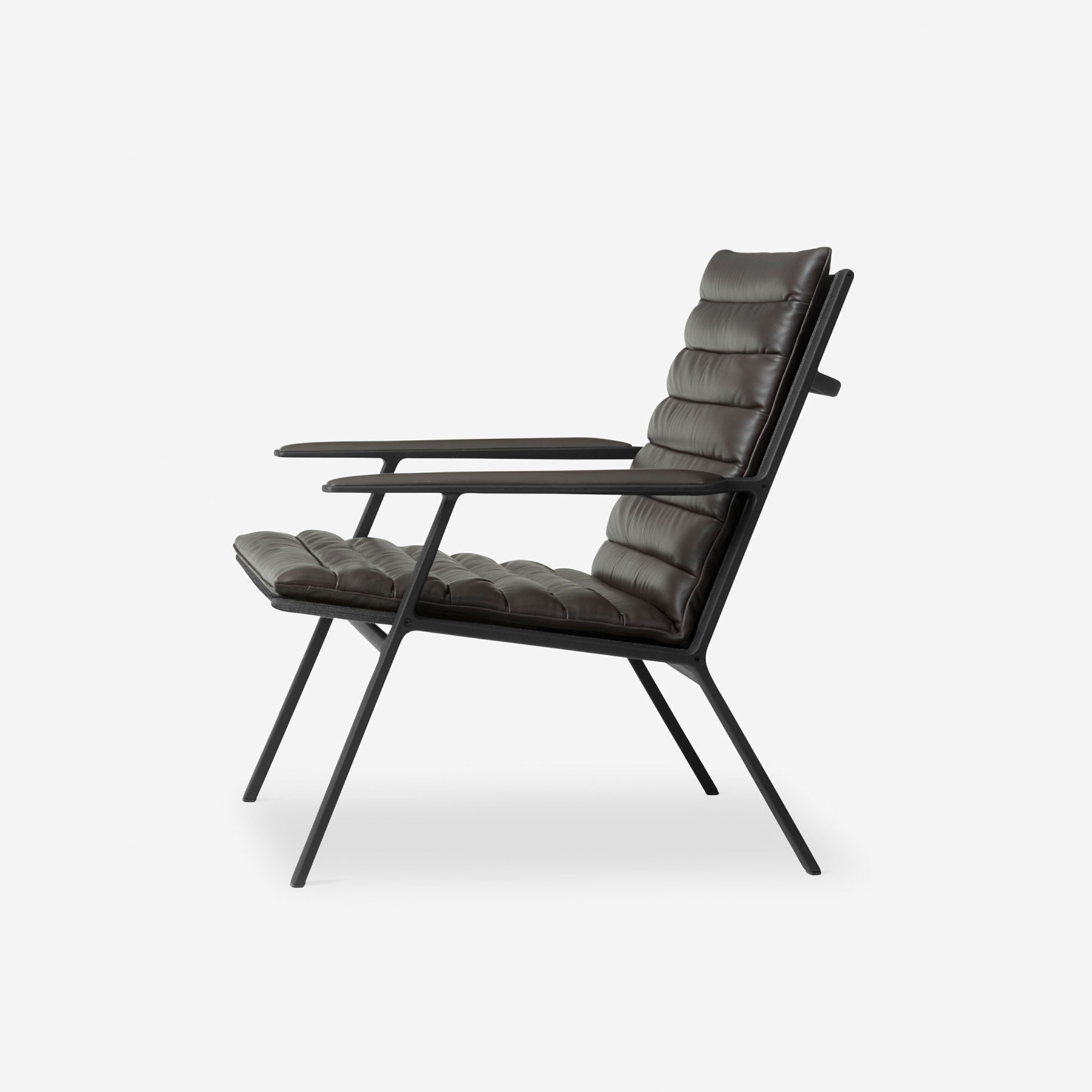 Vipp lenestol passer godt inn i en stue eller lesekrok. Den komfortable stoppede lenestolen har en pulverlakkert aluminiumsramme med polstrede armlener og et svakt vinklet sete og ryggstøtte. Den har avrundede kanter og møbeltrekk i glatt, mørkebrunt lær som tilfører en mykhet til den robuste og presstøpte konstruksjonen.