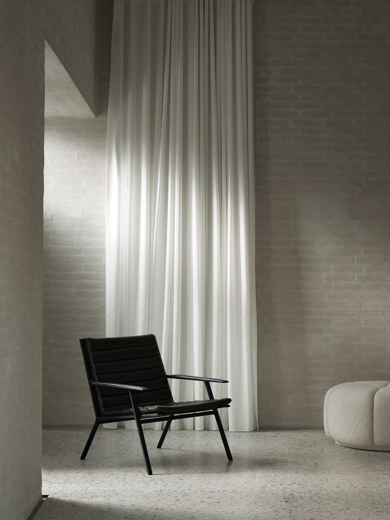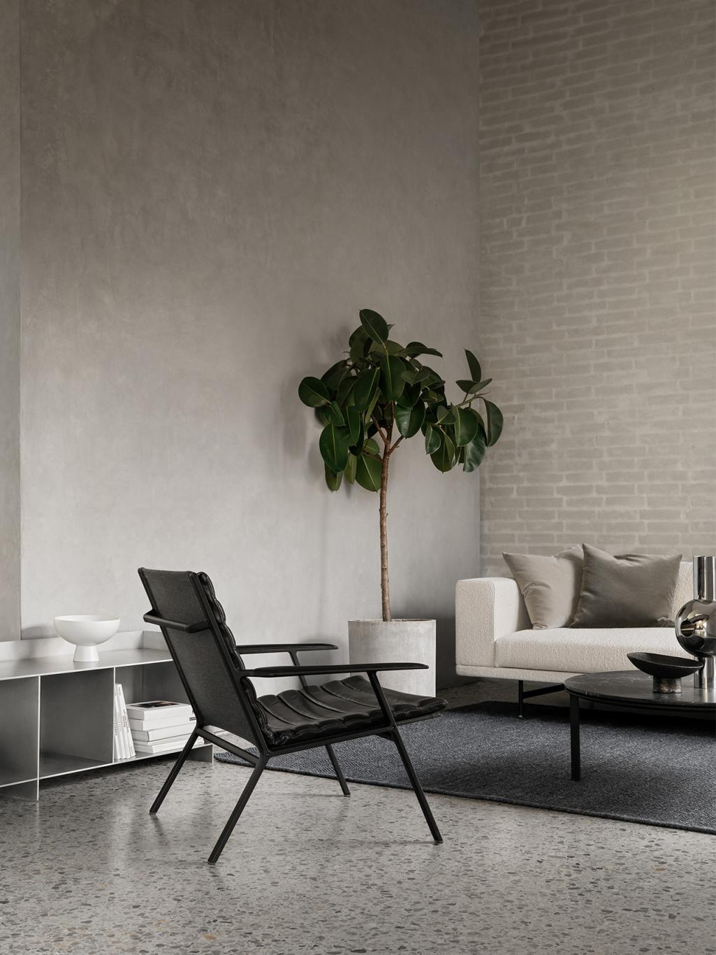 Vipp lenestol er inspirert av monokrom arkitektur og interiør i Vipp Shelter, og lenestolen har lignende attributter uttrykt gjennom valg av solide materialer og møbeltrekk i mørkt lær.