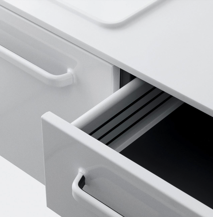 Vipp-bademodulene gir deg en uforstyrret overflate med integrert vask, laget for å motstå alt den blir utsatt for. Avrundede hjørner og en svevende bordplate gir et mykt preg til Vipp-bademodulenes rene estetikk. Små og store skuffer i Vipp bademodul sikrer plass til oppbevaring av nødvendigheter på baderommet.