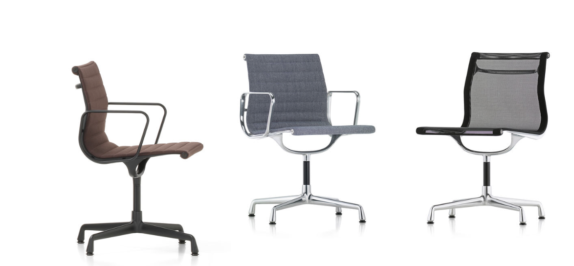 Aluminiumsstolene EA 101, EA 103 og EA 104 av Charles og Ray Eames er ideelle for bruk i kombinasjon med bord: i forhold til de andre modellene i Aluminium-gruppen er de noe lettere, smalere og høyere. Takket være det brede utvalget av dempede eller lyse trekkfarger, er det enkelt å finne den perfekte stolen for ethvert spisestueinteriør. De tre modellene er forskjellige i type sokkel – fast eller svingbar – og om de kommer med eller uten armlener.