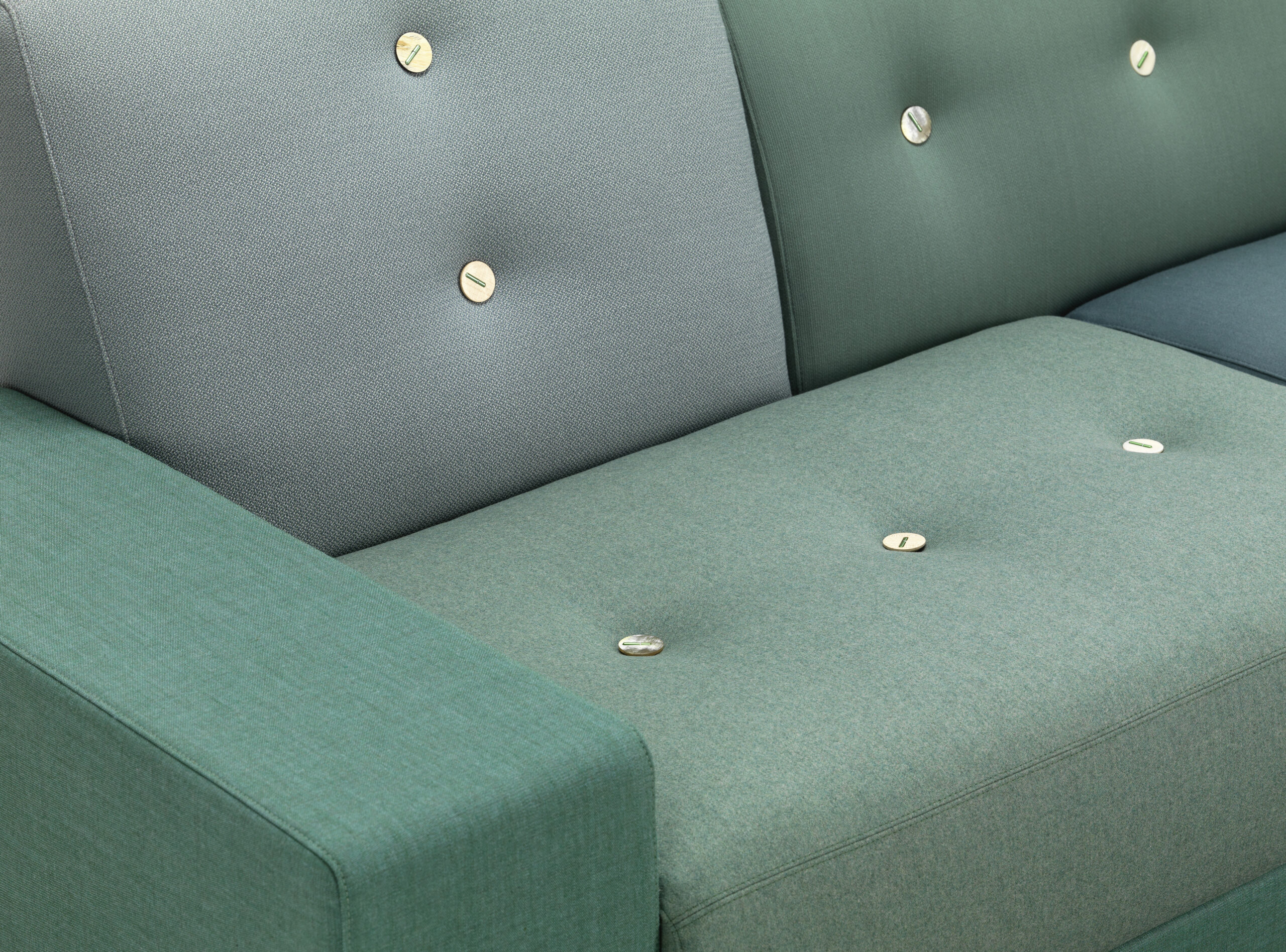 Knappene til Polder-sofaene, designet av Jongerius i en collage av farget plast, aluminium og lær, er en spesielt slående detalj. De gir ikke bare en attraktiv kontrast til de myke vevde stoffene, men lette også lett avmontering av polstrede deksler for rengjøring, takket være en enkel festeanordning.
