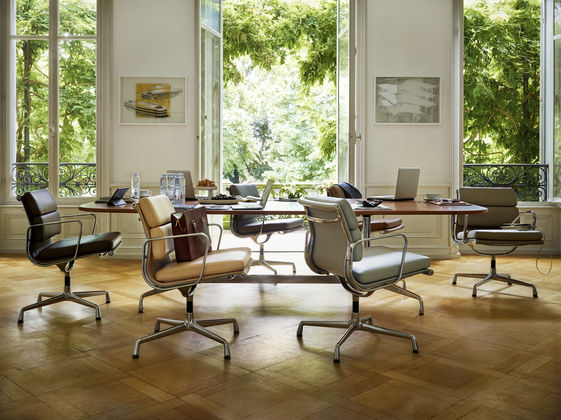 Den ikoniske og likevel underspillede utformingen av Charles og Ray Eames Soft Pad-stoler EA 205, 207 og 208 gjør dem til et ideelt valg for prestisjefylte møte- og konferanserom. Deres frodige polstring sikrer myk sittekomfort. Med et utvalg av to forskjellige typer lærdeksler i et stort utvalg av farger, kan kundene finne den rette versjonen for hvert interiør.