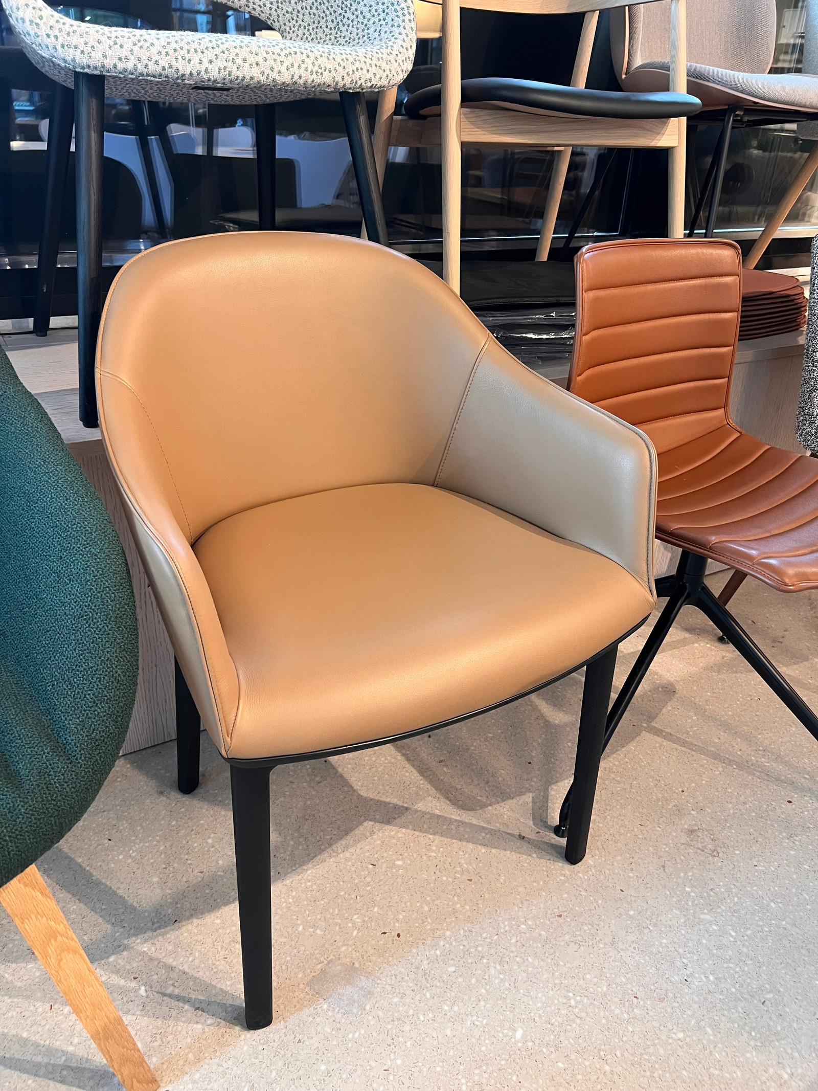 Vi selger nå Softshell spisestoler i eksklusivt camel-farget lær fra Vitra til rabattert pris gjennom vårt utstillingssalg.